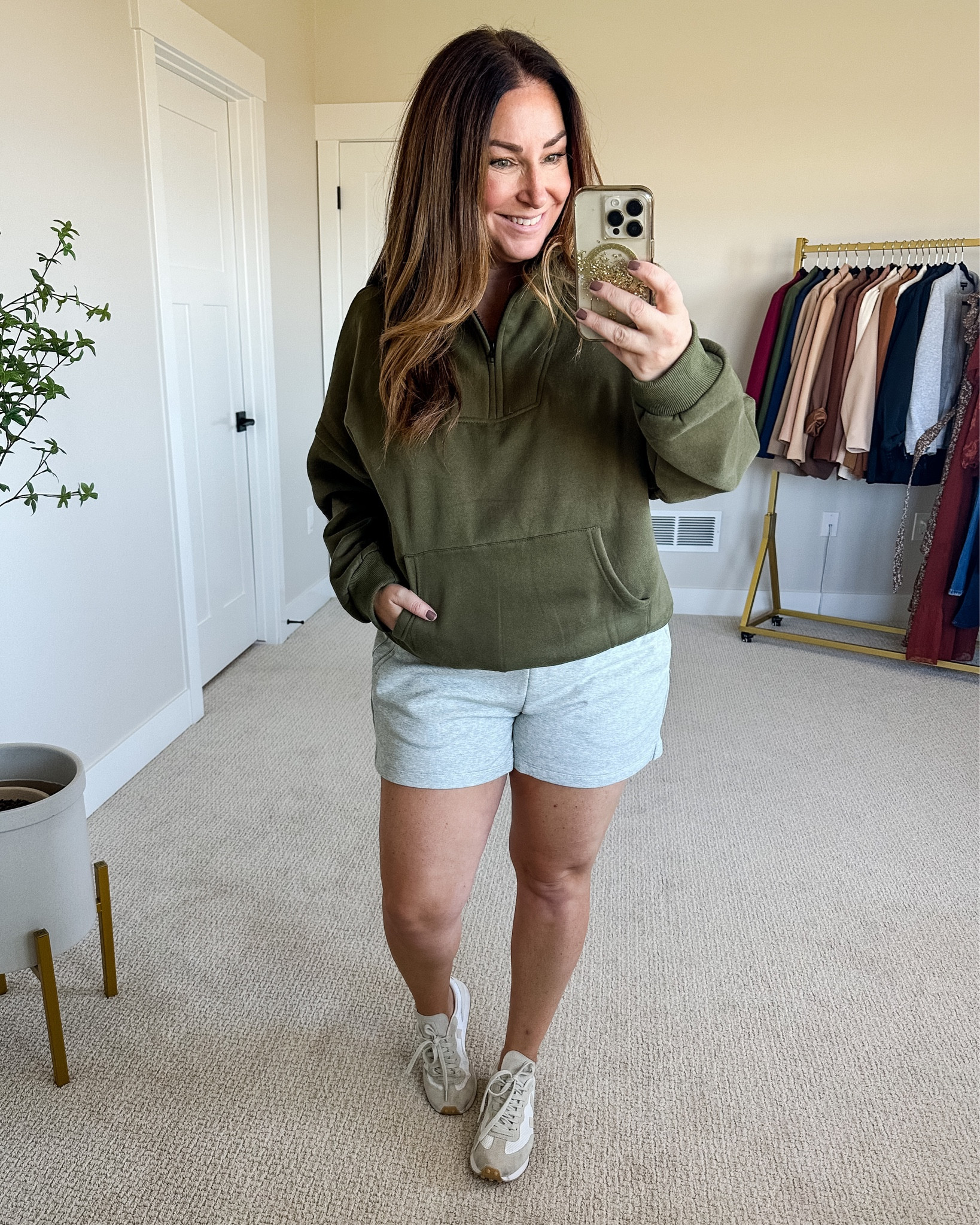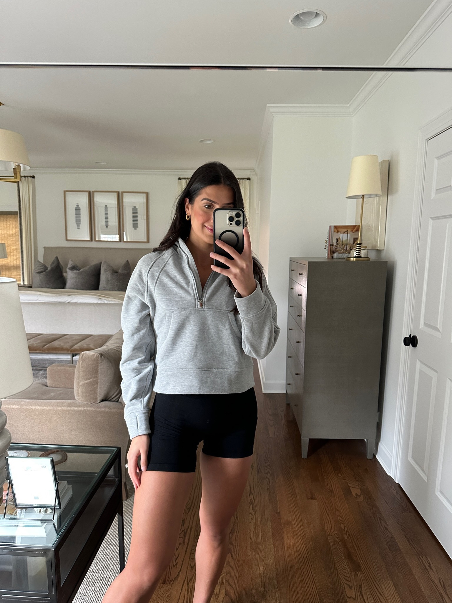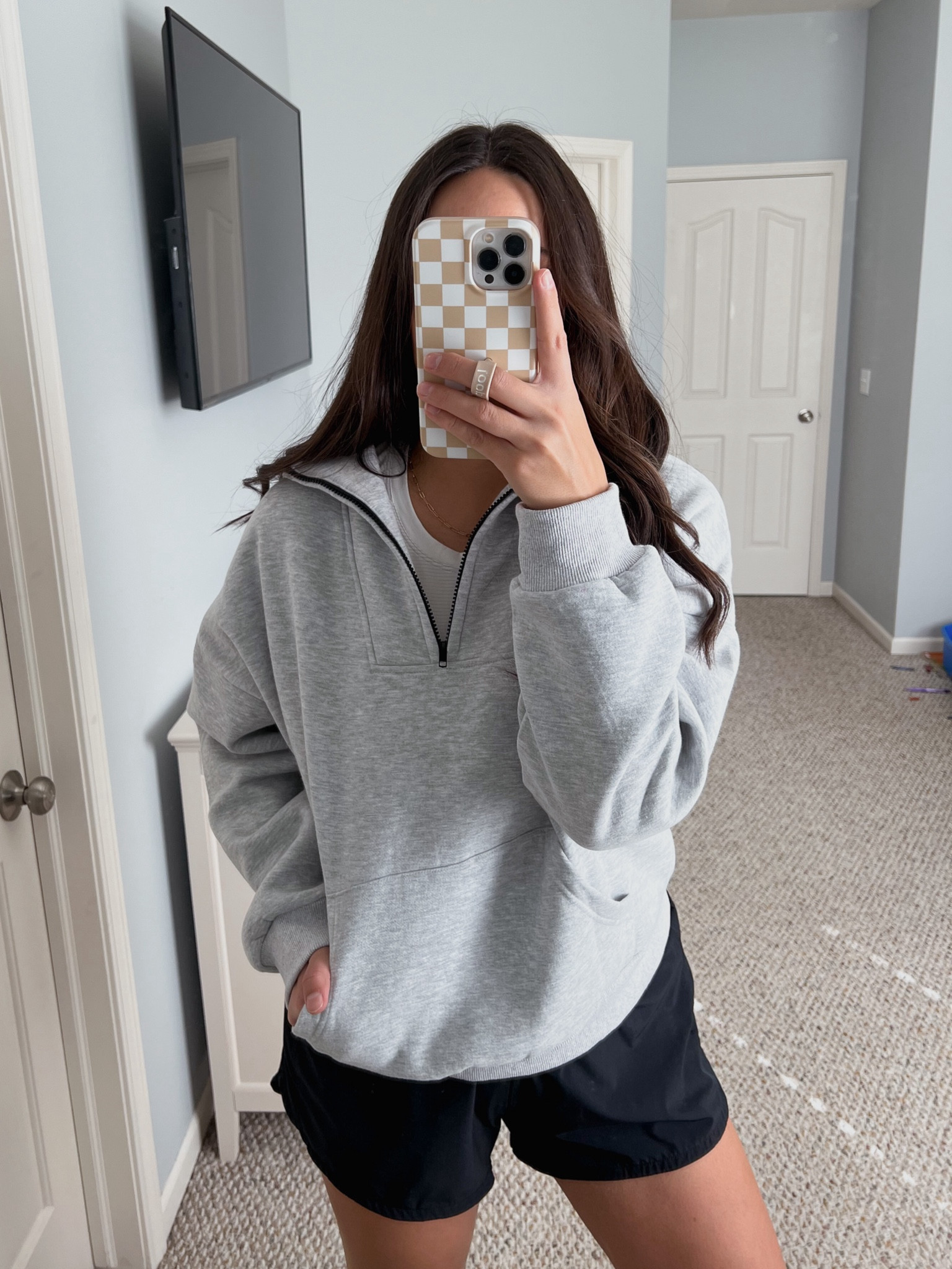 The outfit exemplifies casual comfort with a classic grey sweatshirt that ensures versatility and ease, while the black shorts add a sleek, sporty edge. It’s a perfect blend for an effortless, everyday style that is both practical and fashionable.