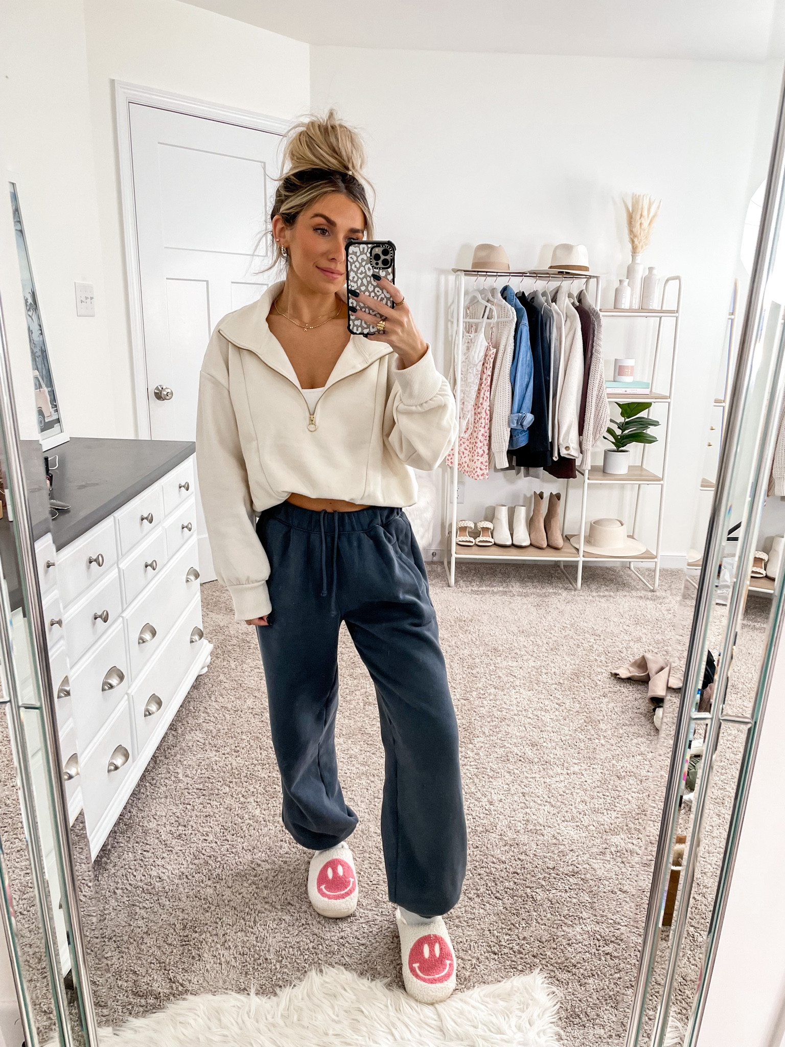 The outfit exudes a relaxed yet trendy vibe, with its neutral color palette that offers a chic and timeless appeal. The pairing of the comfortable fit with the stylish sneakers makes it perfect for a casual, put-together look that’s great for everyday wear.