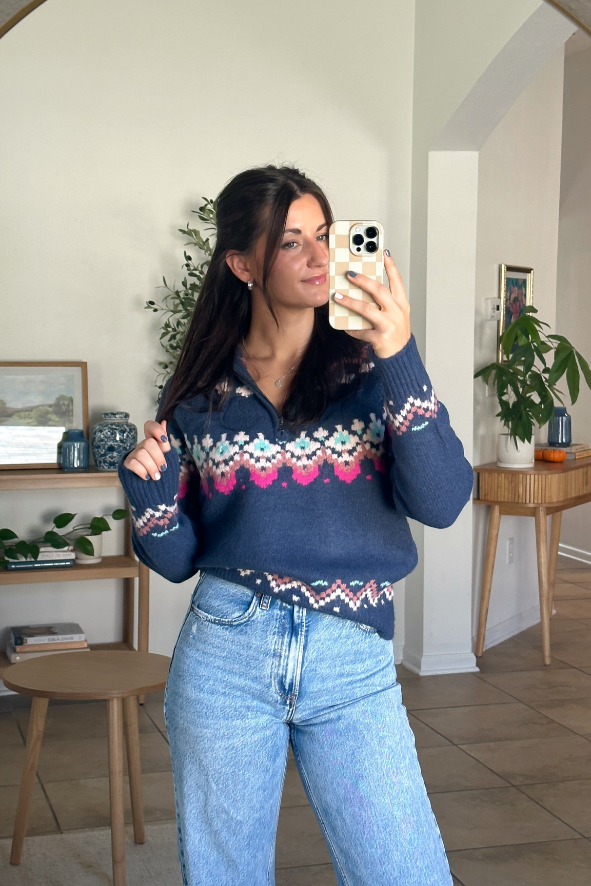 The vibrant patterned sweater adds a playful touch to the ensemble, infusing color and texture that perfectly complement the classic, relaxed-fit jeans. This balanced combination creates a casual yet stylish aesthetic that’s versatile for various everyday occasions.
