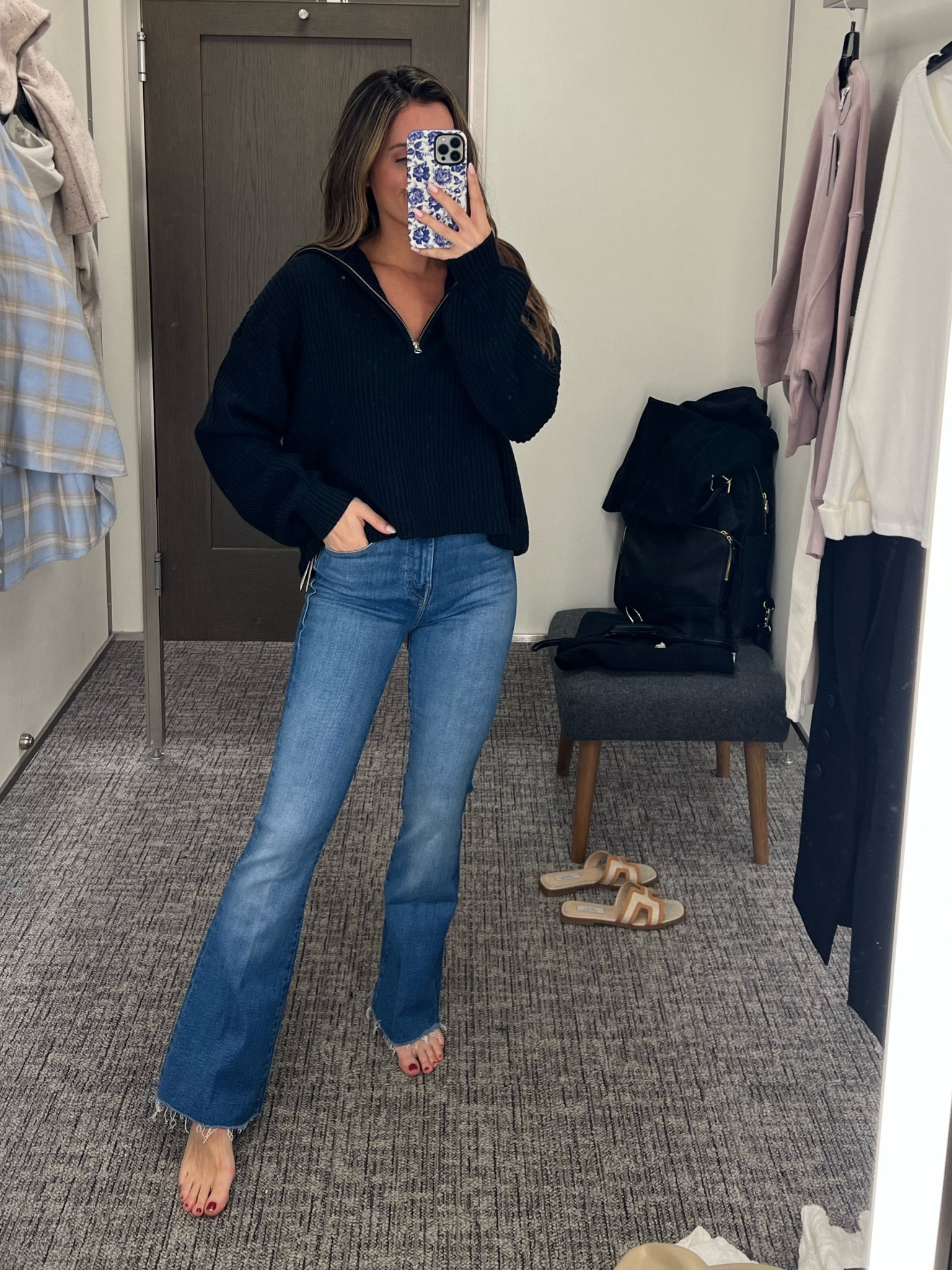 The relaxed fit of the dark V-neck sweater perfectly balances the silhouette of the flared jeans, creating a chic, effortless look. The simplicity of the ensemble serves as a versatile canvas for accessorizing, making it ideal for both casual and smart-casual occasions.