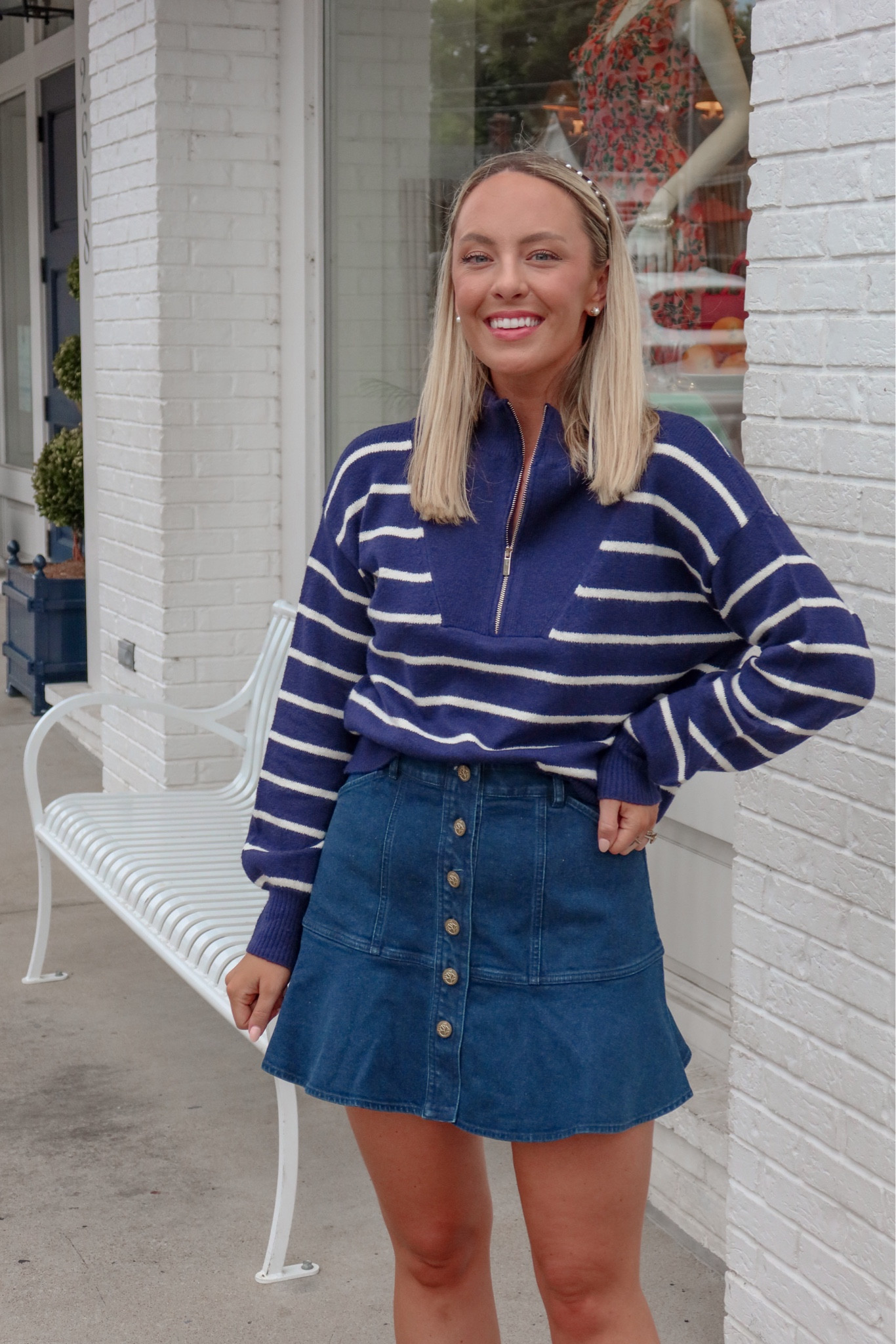 The navy and white striped sweater offers a classic nautical vibe, bringing a casual yet chic element to the ensemble. The denim skirt complements the top with its timeless A-line cut, creating a balanced and effortlessly stylish look that’s perfect for a day out.