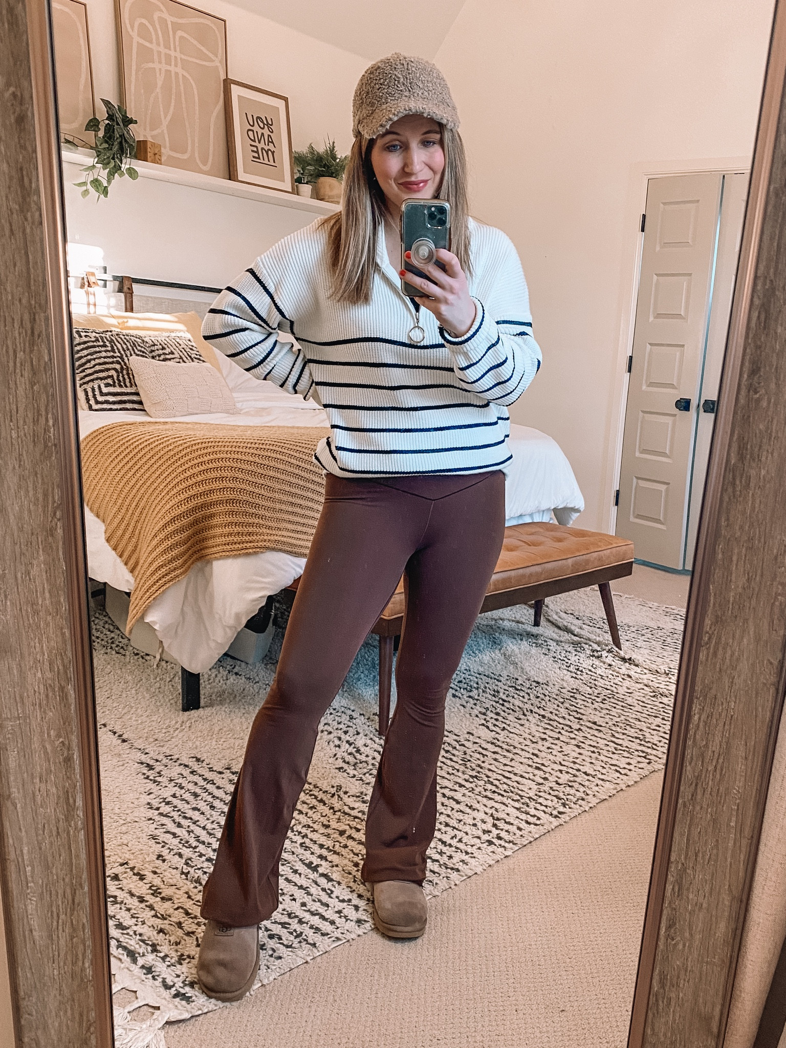 The combination of the striped sweater and flared pants creates a chic, retro-inspired look, while the hat adds a cozy, on-trend touch perfect for seasonal transitions. The earthy color palette is harmonious and grounding, exuding a sense of warmth and sophistication.