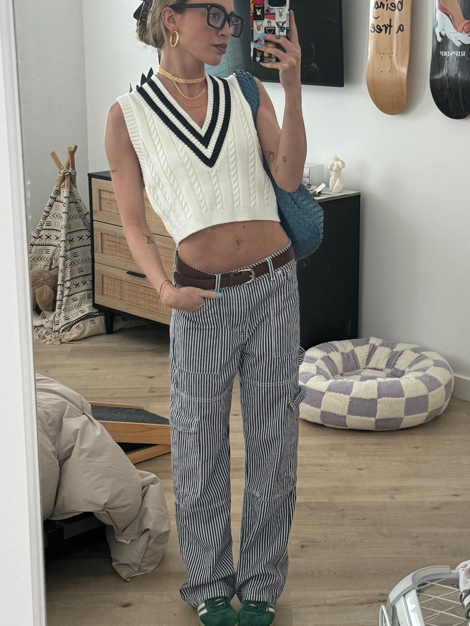 The bold contrast between the classic white and navy V-neck sweater vest and the pinstripe trousers creates a playful yet sophisticated look, while the bright green shoes add an unexpected pop of color that really makes the ensemble stand out. The look is complemented by the choice of accessories, enhancing its contemporary edge.