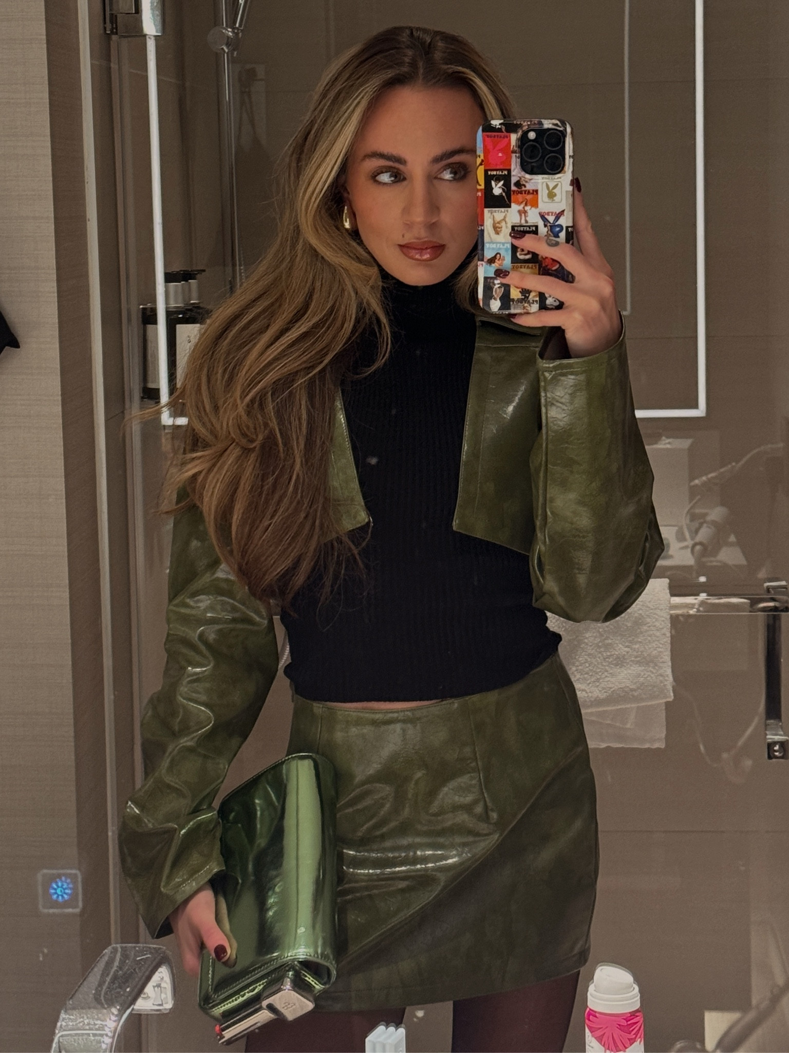The ensemble exudes a chic and edgy vibe with its monochromatic green color scheme, while the pairing of a sleek turtleneck with a leather skirt and jacket adds a perfect balance of texture and sophistication. The outfit’s streamlined silhouette is both contemporary and flattering, highlighting a keen eye for style that embraces bold yet classic fashion statements.