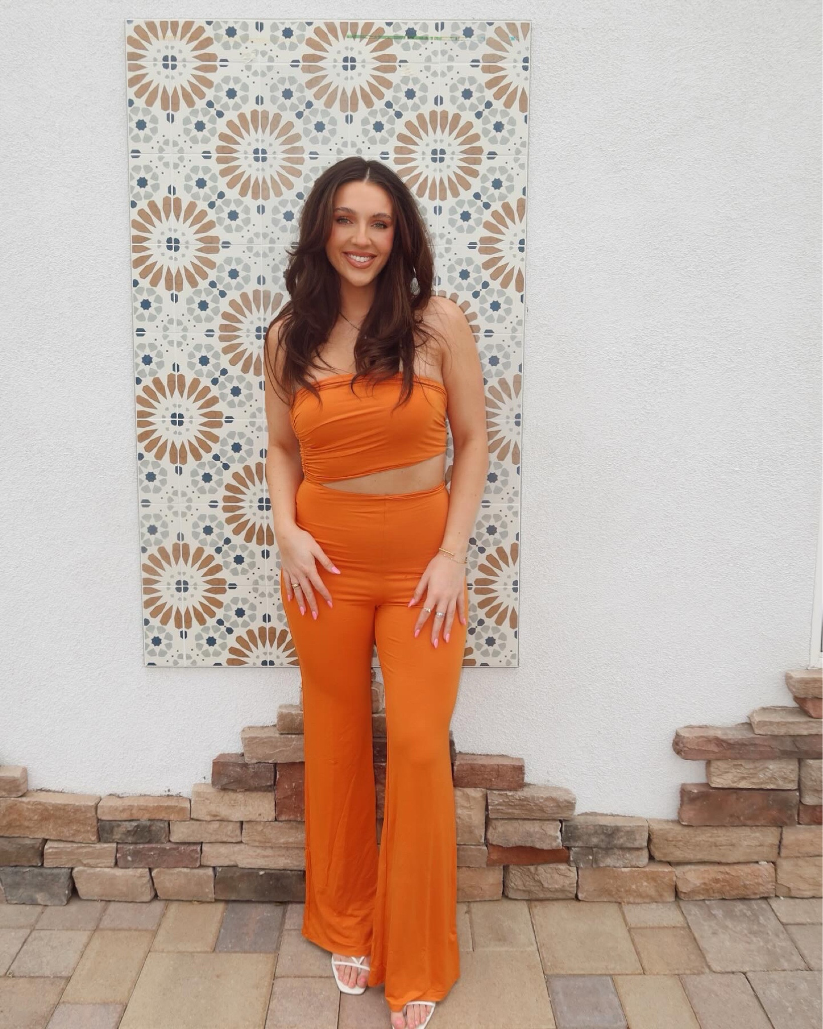 The vibrant orange hue of the ensemble gives it a lively and cheerful vibe, perfect for standing out in any social gathering. Additionally, the coordinated two-piece with a flattering wrap top and wide-leg pants offers a chic, streamlined look that accentuates the wearer’s silhouette.