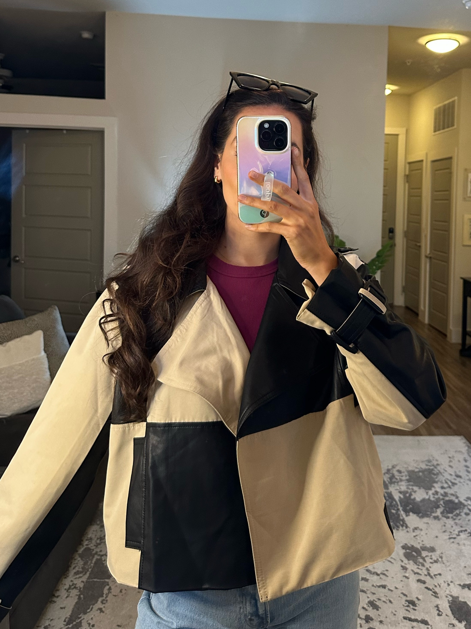 The color-blocked jacket offers a bold, modern twist to a classic silhouette, creating a striking visual contrast, while the fitted magenta turtleneck underneath provides a pop of color, enhancing the overall sophistication of the look.