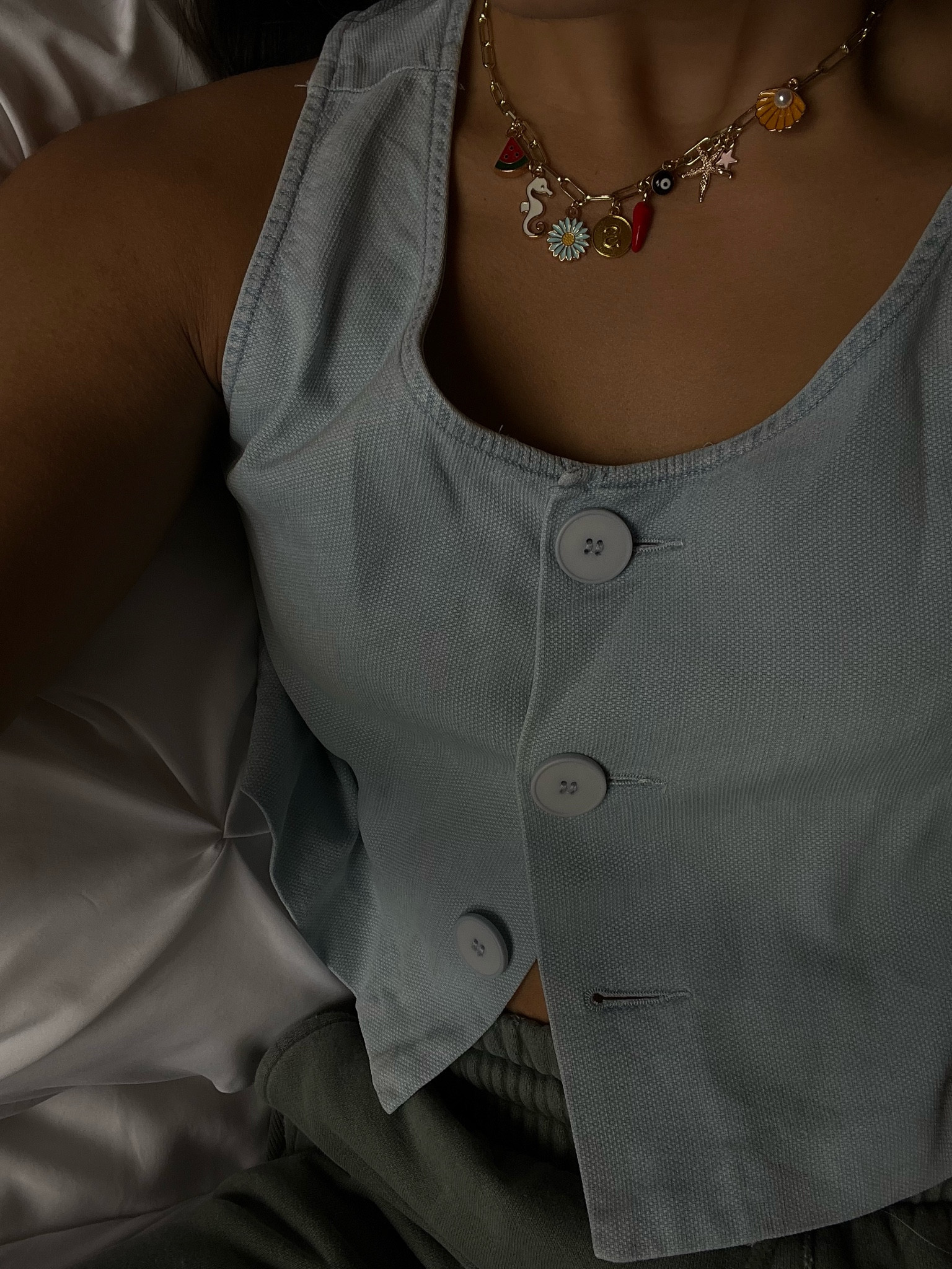 The textured fabric of the top adds a tactile quality that plays well with light, while the choice of a chunky necklace introduces a pop of color and whimsy that elevates the whole ensemble. The alignment of buttons gives a clean, vertical line that enhances the structure of the outfit.