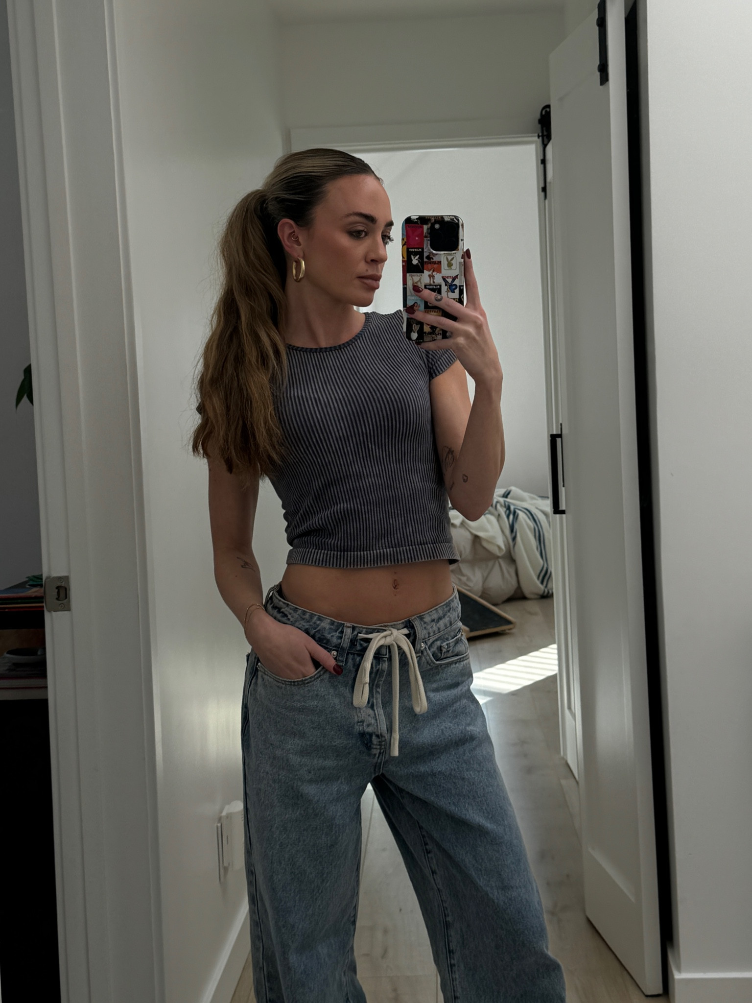 The cropped top seamlessly blends casual comfort with a touch of trendy appeal, highlighting the waist and offering a flattering silhouette, while the high-waisted, wide-leg jeans provide a contemporary twist on classic denim, accentuating the length of the legs and creating an effortlessly chic ensemble.