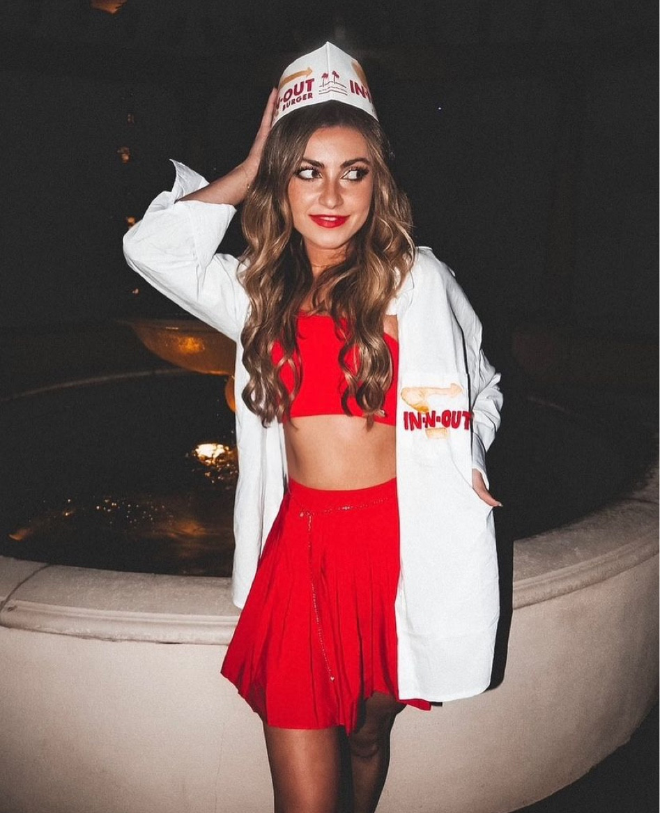 The outfit presents a playful yet chic homage to the In-N-Out brand, with its vibrant red color palette creating a bold statement, while the fitted crop top and flared skirt offer a flirty and fashionable silhouette. The accessory choice of a branded cap adds a fun twist that completes the ensemble with a touch of retro Americana.