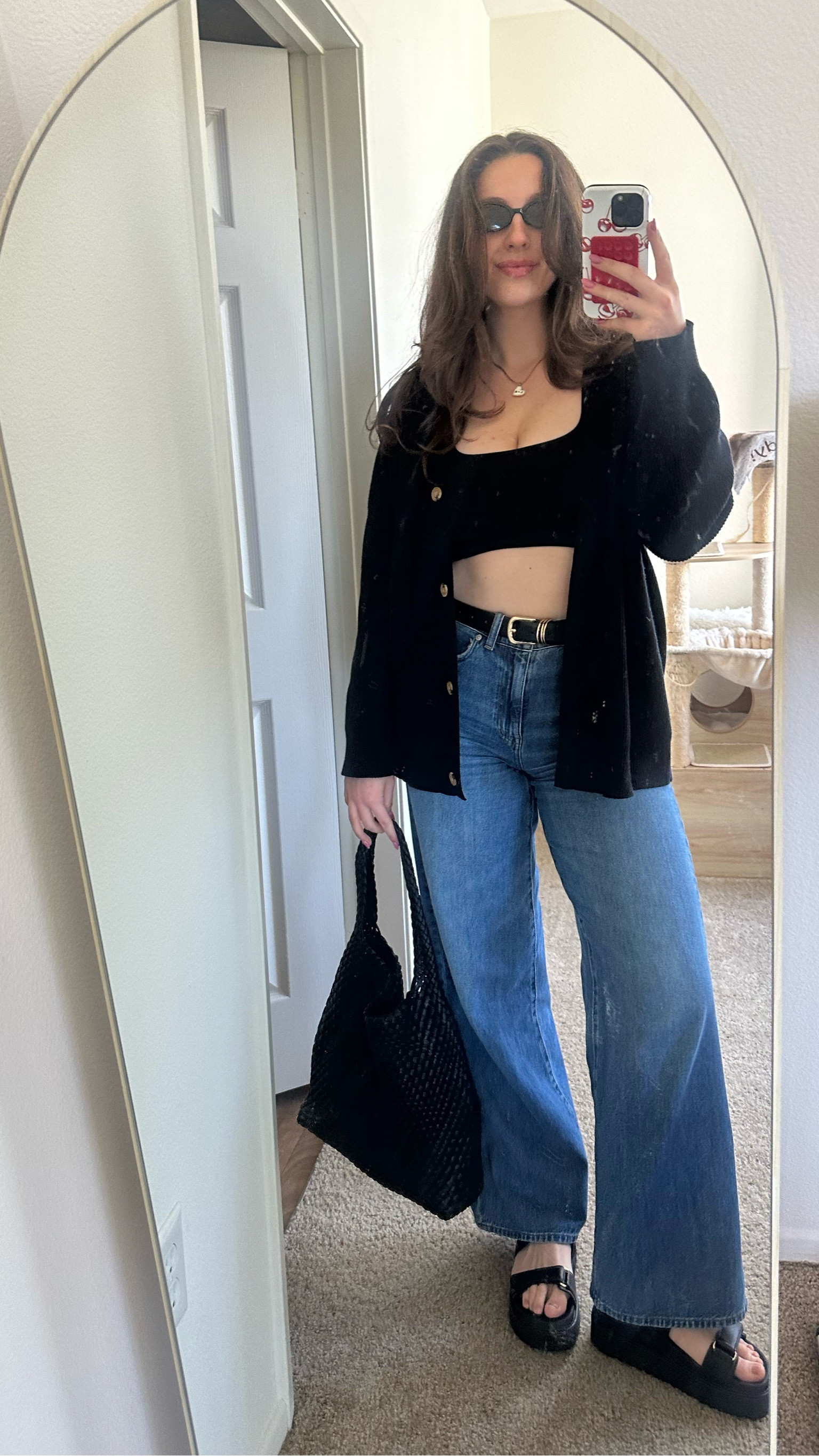 The high-waisted jeans elongate the legs and create a flattering silhouette, while the cropped top adds a modern touch that balances the structured appeal of the velvety blazer. The ensemble is elevated with chic accessories, like the statement sunglasses and textured bag, infusing personality and elegance.
