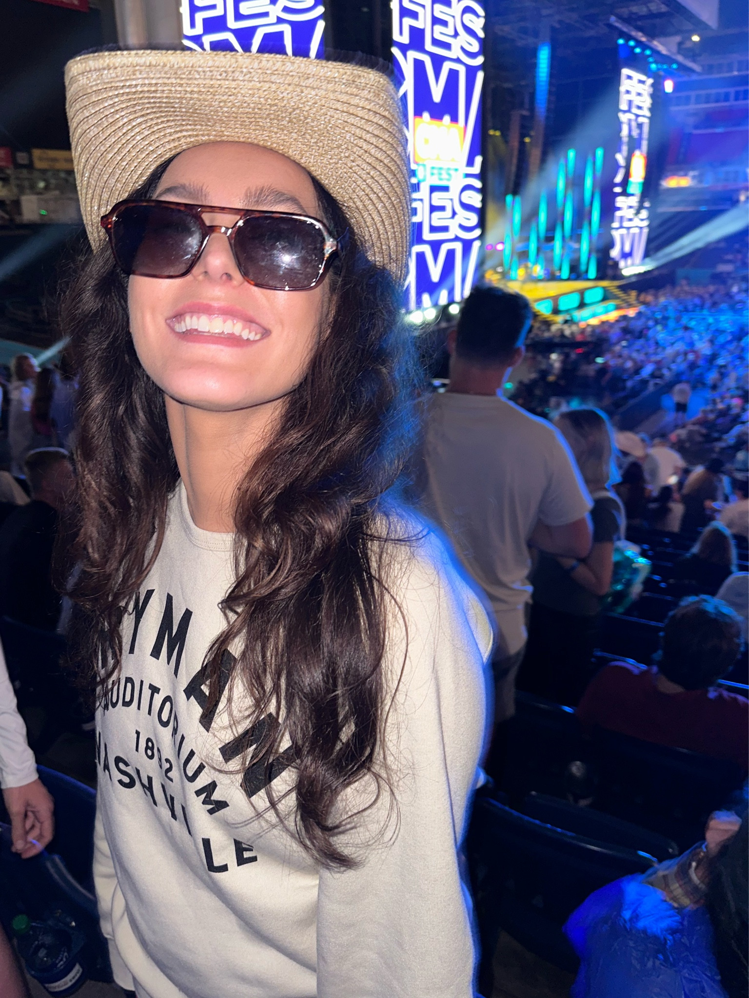 The casual, oversized sweatshirt pairs effortlessly with the straw hat for a relaxed yet stylish look, perfect for a music festival vibe. The large sunglasses add a touch of chic sophistication, balancing the laid-back ensemble with an air of mystery.