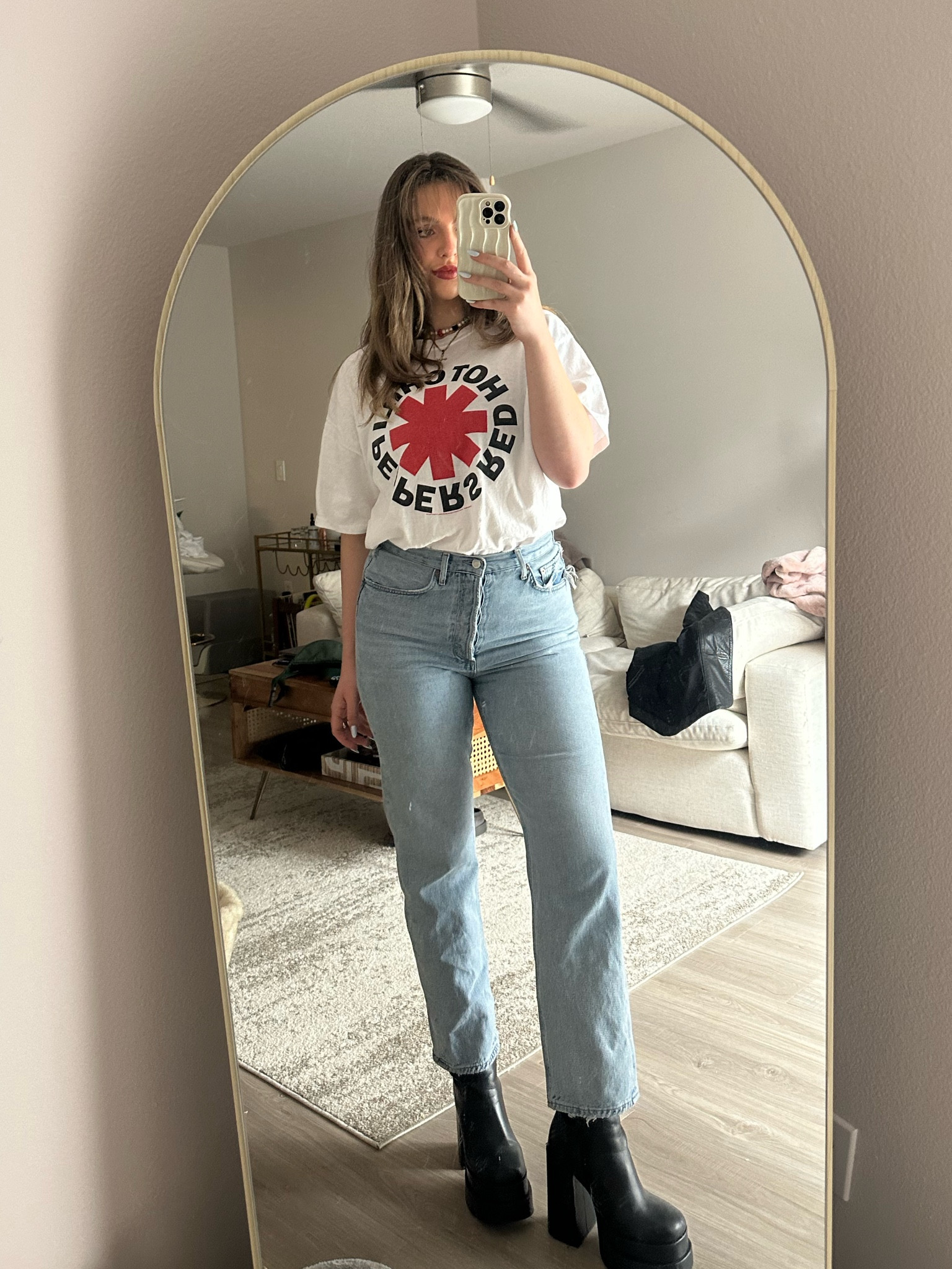 The high-waisted jeans and platform boots elongate the legs, creating an elegant silhouette, while the graphic tee adds a playful, casual touch that’s perfect for a daytime ensemble. This outfit masterfully balances comfort and style, making it both trendy and effortlessly chic.
