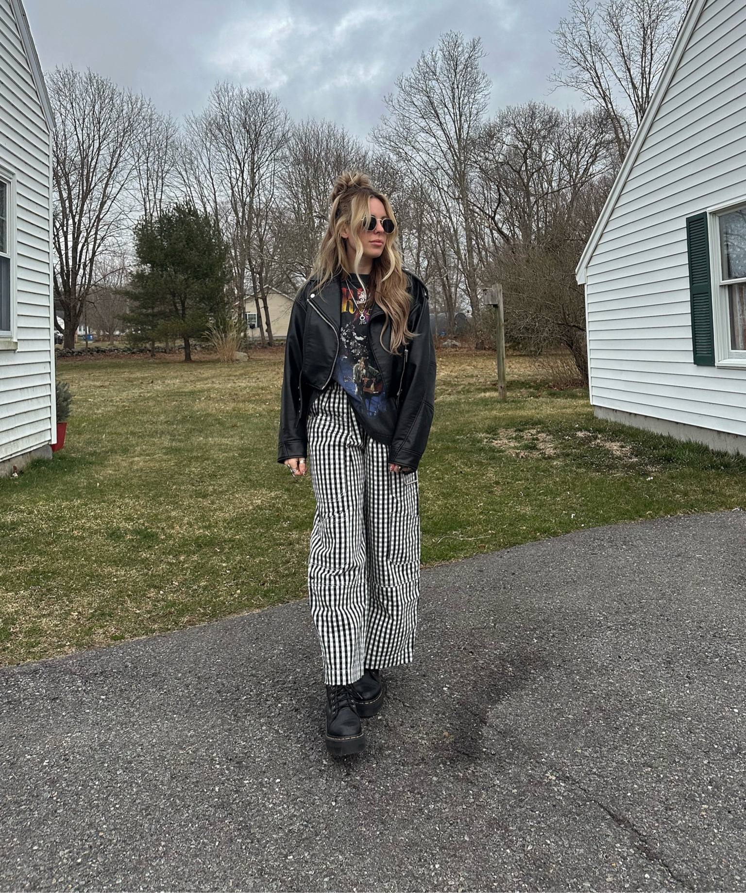The juxtaposition of the classic leather jacket with the playful checkered pants creates an edgy yet whimsical aesthetic. The pairing with chunky boots adds a modern, urban flair to this fashion-forward ensemble.