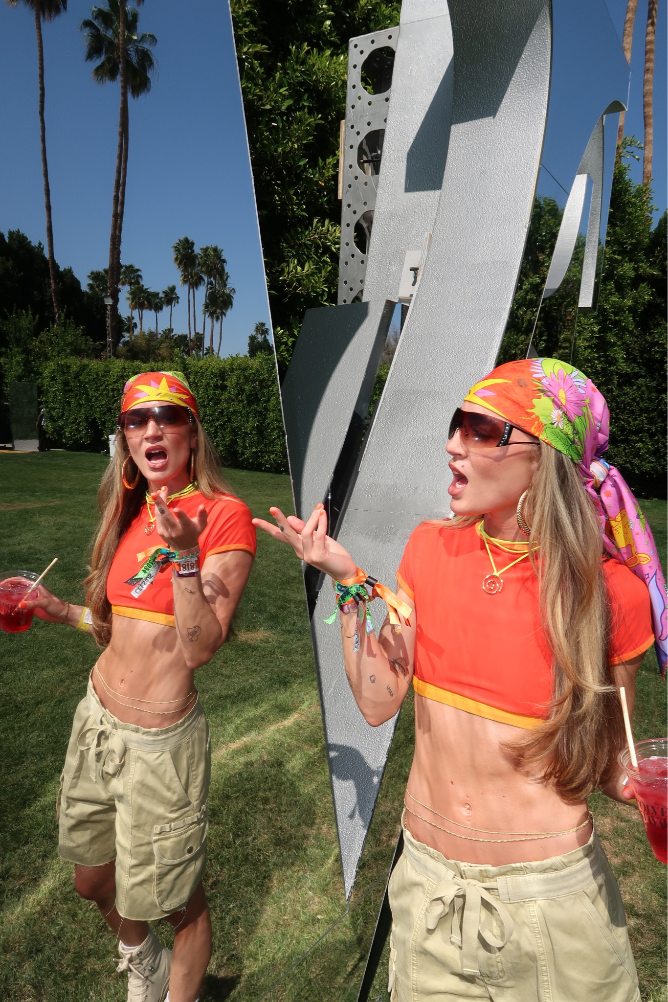 The outfit flawlessly captures a casual yet edgy festival vibe with a playful balance of utility through the cargo pants and a touch of glamor via the embellished top. The accessories, especially the cap and sunglasses, add a dash of cool, melding both comfort and style suited for an outdoor event.