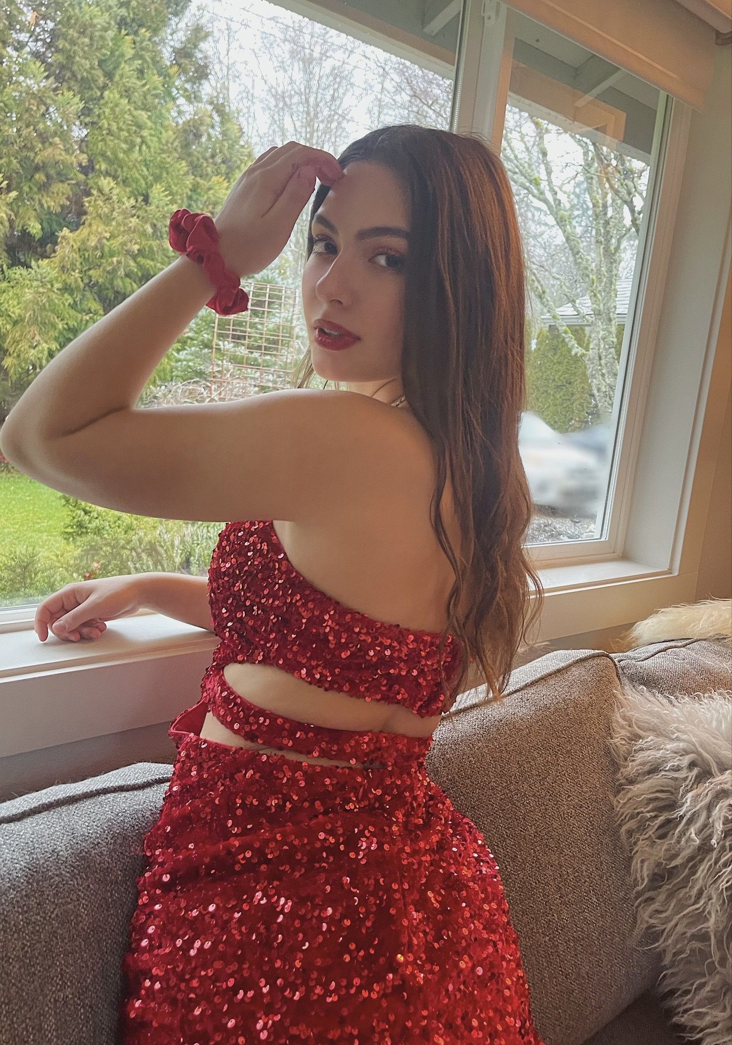 The sequined red dress exudes elegance and glamour, with its eye-catching sparkle and tasteful cutout design that accentuates the waist. The matching red scrunchie on the wrist adds a playful touch, effectively harmonizing with the outfit’s festive feel.