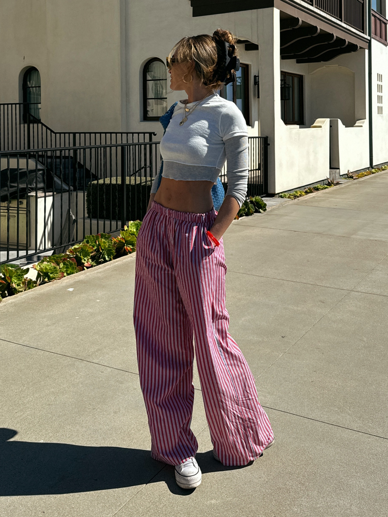 The high-waisted, striped pants create a bold statement with their wide-leg silhouette, offering both comfort and a flair of sophistication. The cropped top adds a playful touch, balancing the outfit with a modern, youthful edge that’s perfect for a casual, sunny day out.