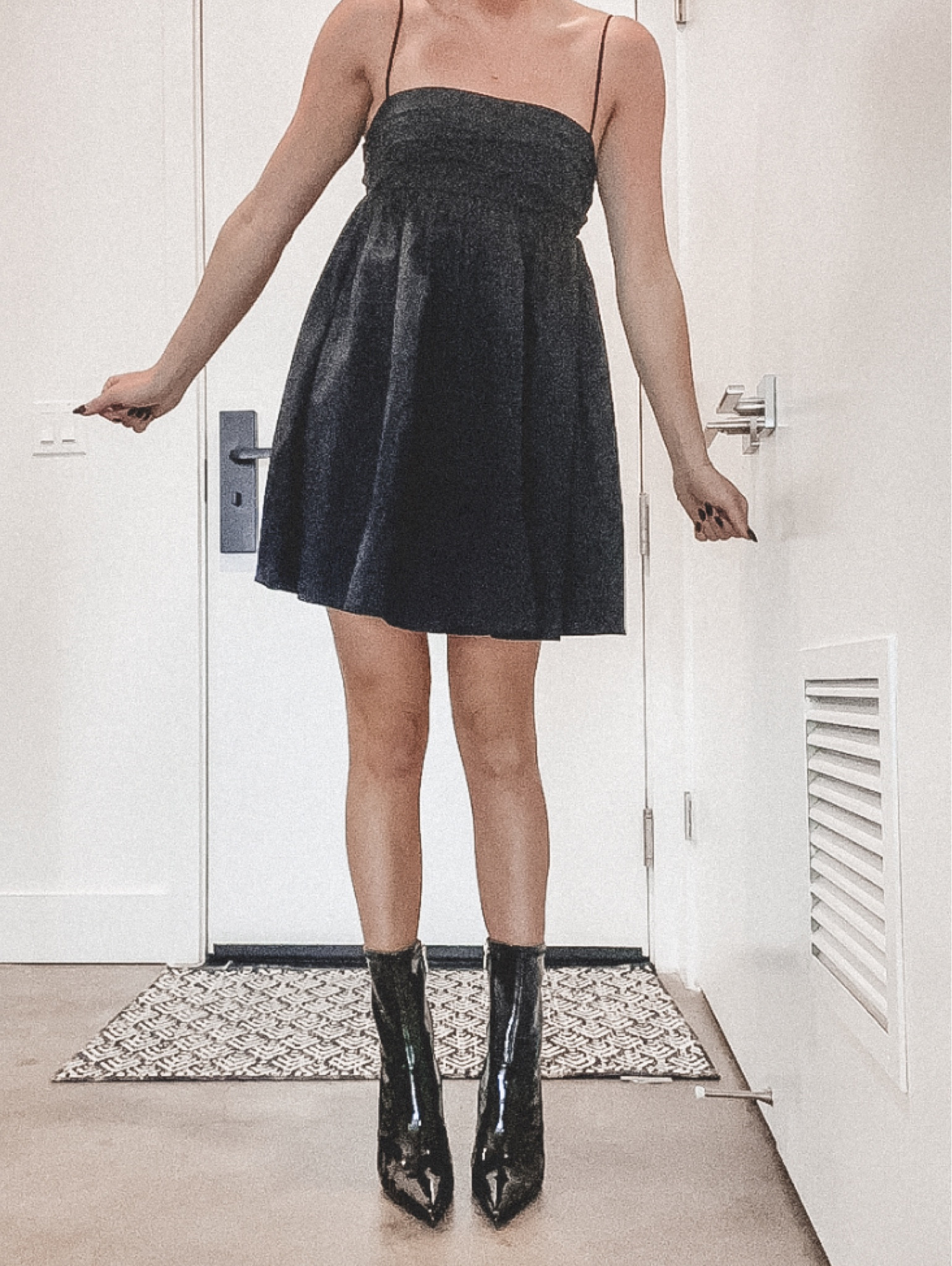 The strapless black dress exudes effortless elegance with its flattering A-line silhouette, which pairs beautifully with the glossy black boots that add an edgy yet chic touch to the ensemble. This outfit balances simplicity with a statement, making it versatile for various occasions.