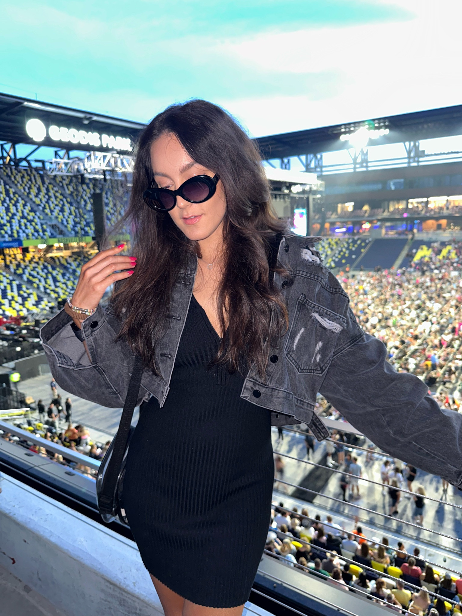 The black dress paired with a classic denim jacket offers a chic, timeless look, perfect for a casual yet sophisticated vibe. Accessorized with stylish sunglasses and a crossbody bag, this ensemble is both fashionable and functional for an event.
