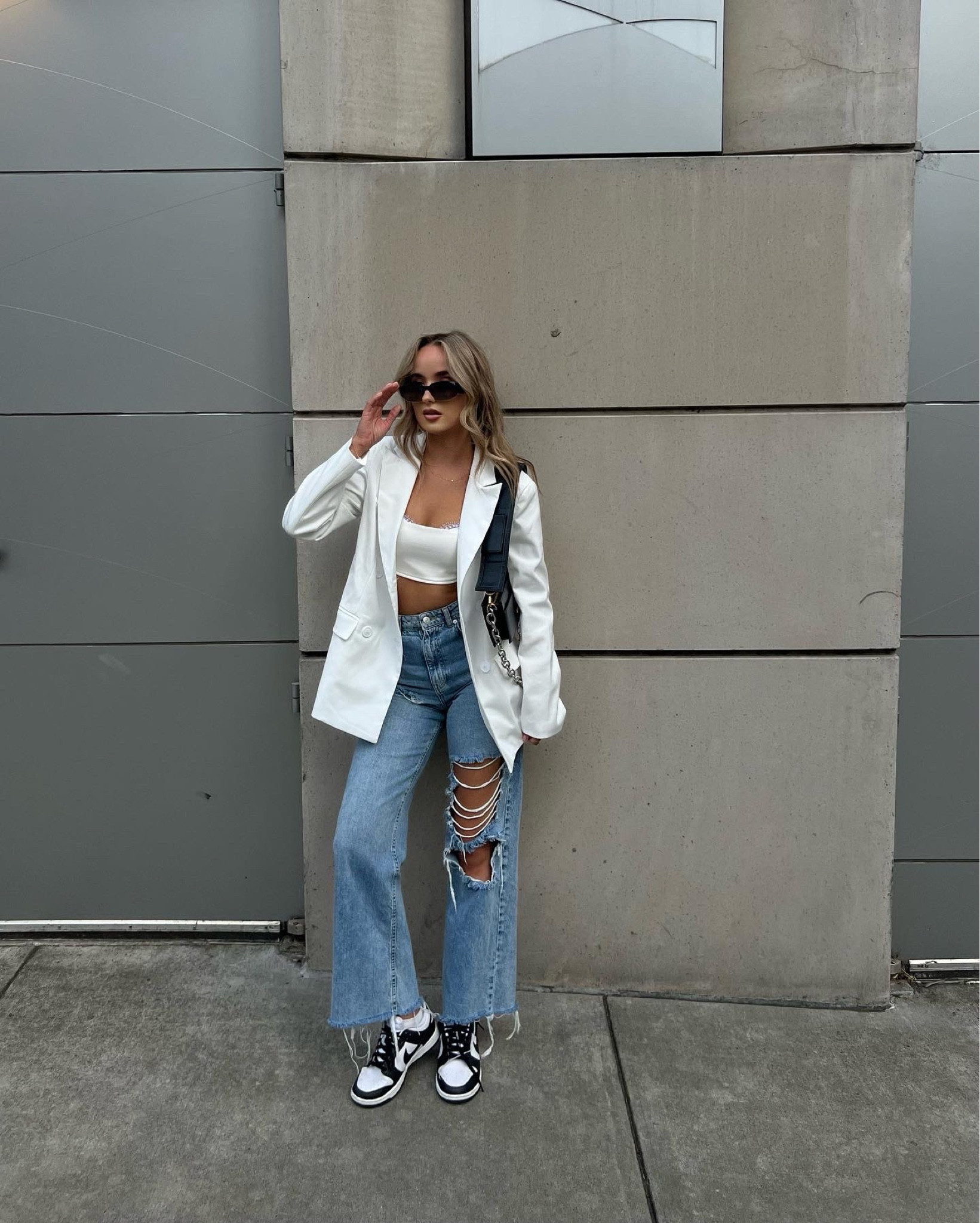 This ensemble expertly balances edgy and chic, with distressed jeans making a bold statement against the crisp, tailored white blazer. The choice of classic sneakers adds an effortless, cool vibe, perfect for a casual yet trendy look.