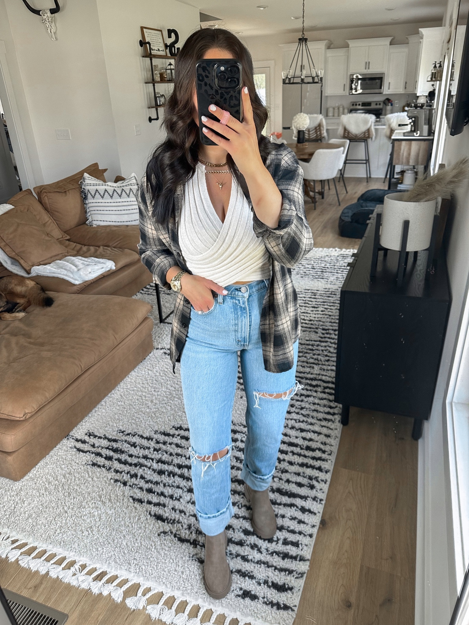 This ensemble effectively balances comfort with style, showcasing the timeless appeal of a classic plaid shirt layered over a casual yet chic draped white top. The distressed jeans add an edgy touch, while the ankle boots elongate the silhouette, creating a laidback yet put-together look perfect for day-to-day wear.