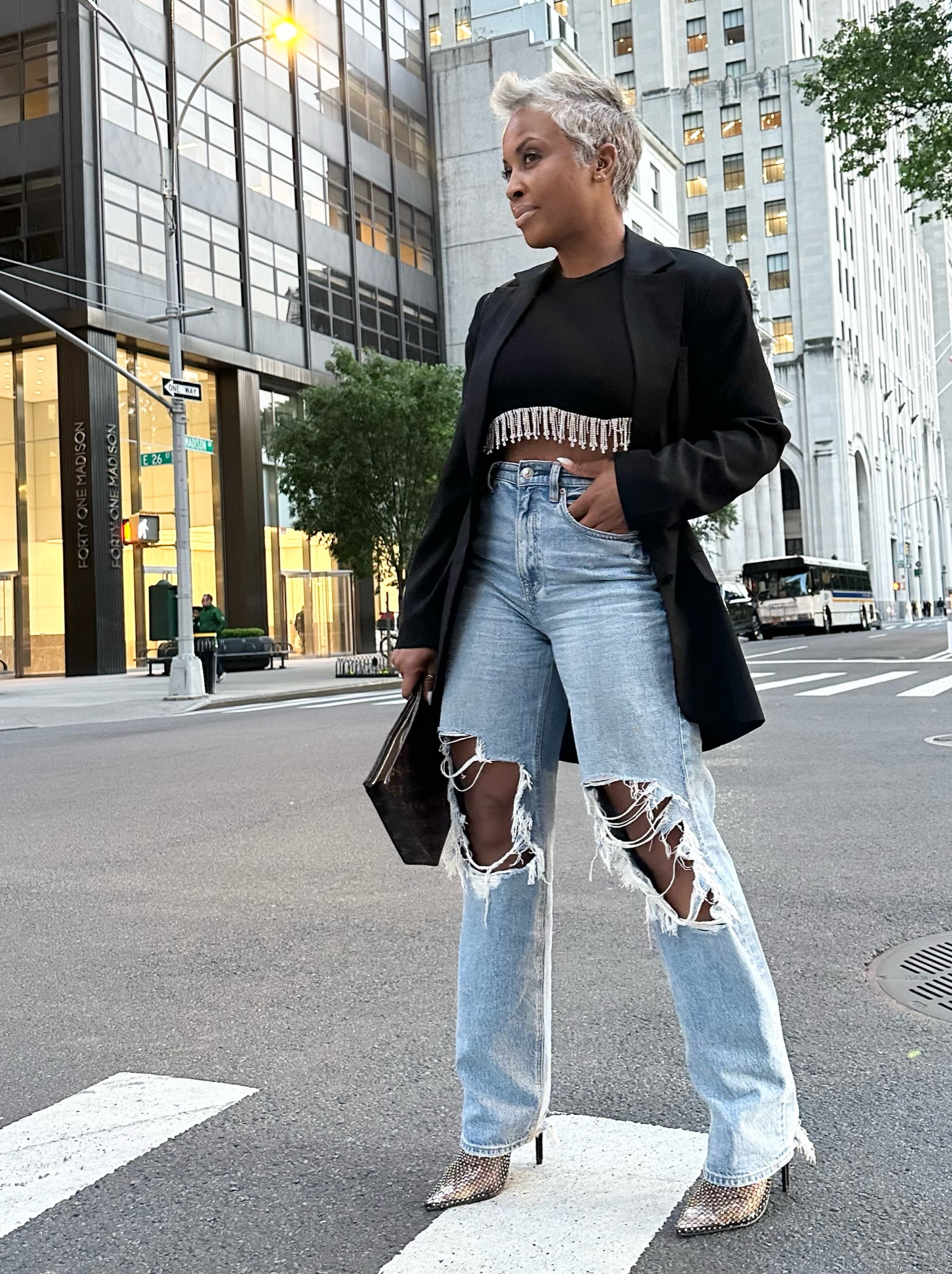 The juxtaposition of the classic black blazer with distressed denim creates a bold, edgy look that’s softened by the playful fringed hem. The textured snake-print heels add an upscale touch, seamlessly elevating the ensemble’s overall urban sophistication.