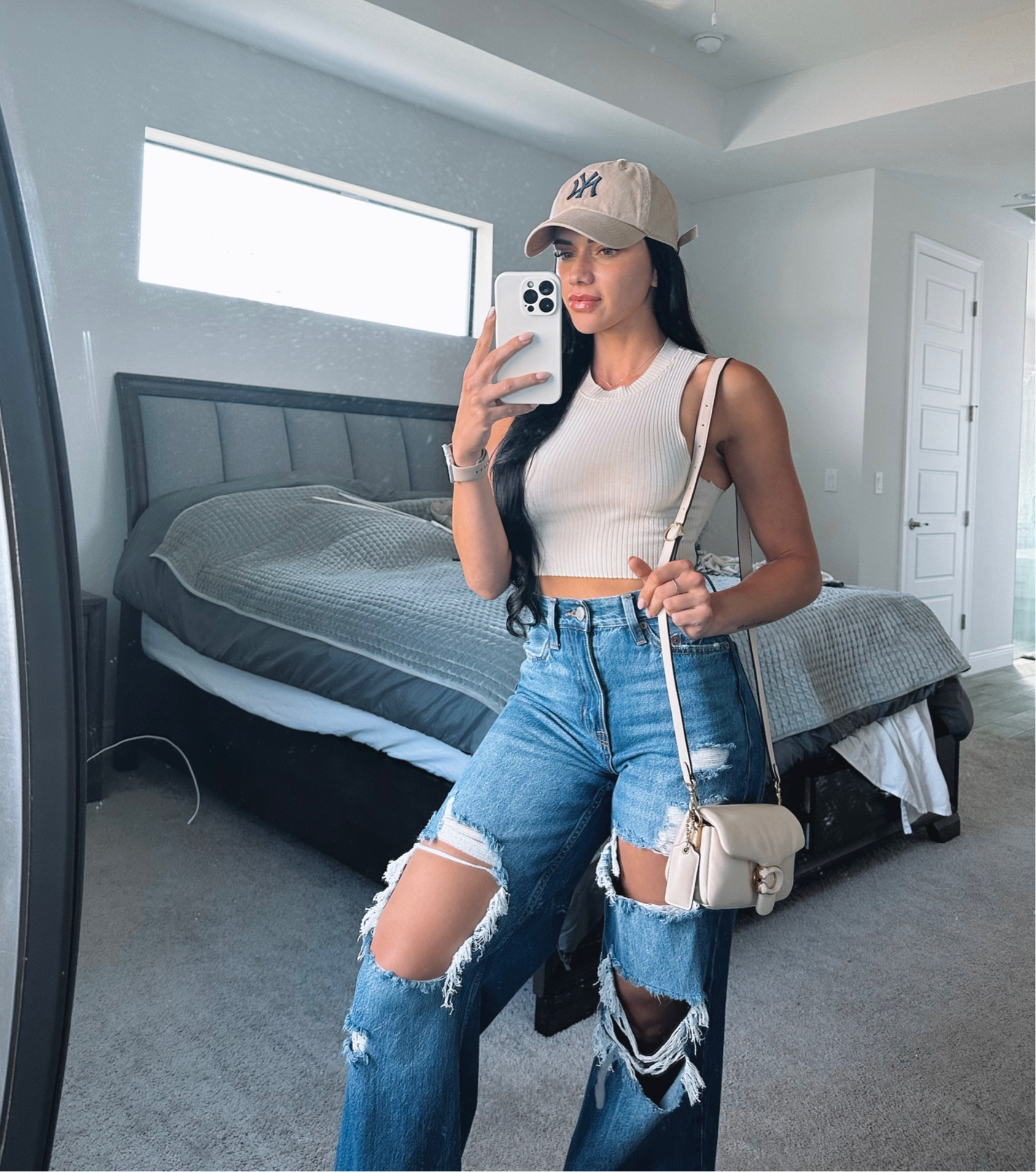 The outfit showcases a balanced blend of street style and casual chic with its distressed denim adding edge, while the fitted tank top keeps it sleek and feminine. Accessories like the baseball cap and crossbody bag add a practical yet stylish touch, perfect for a day out.
