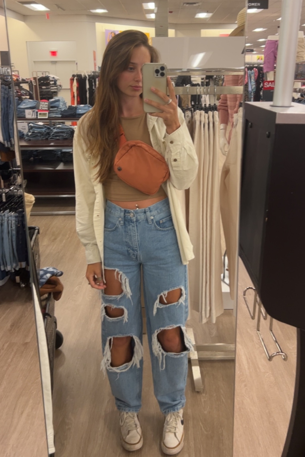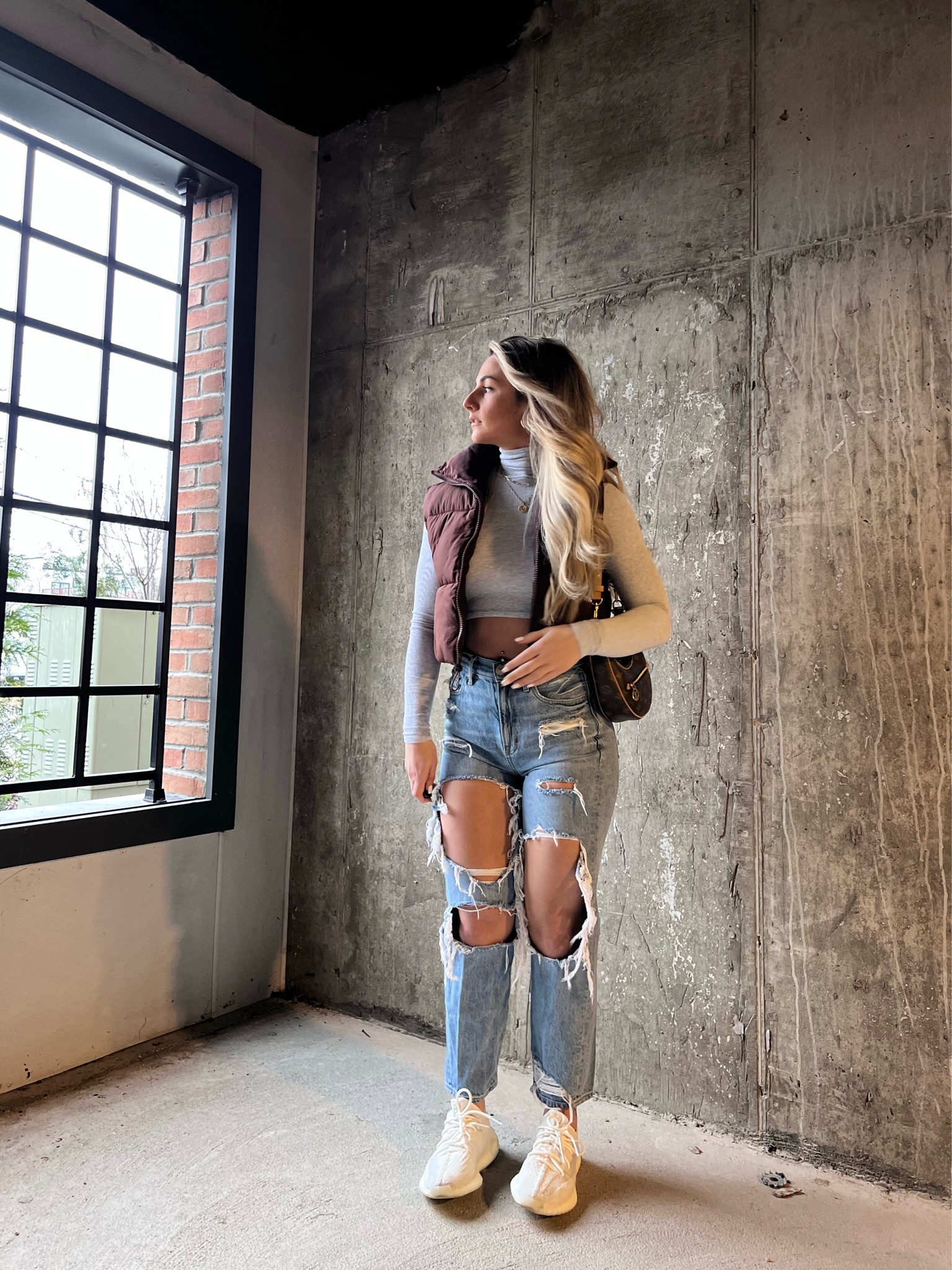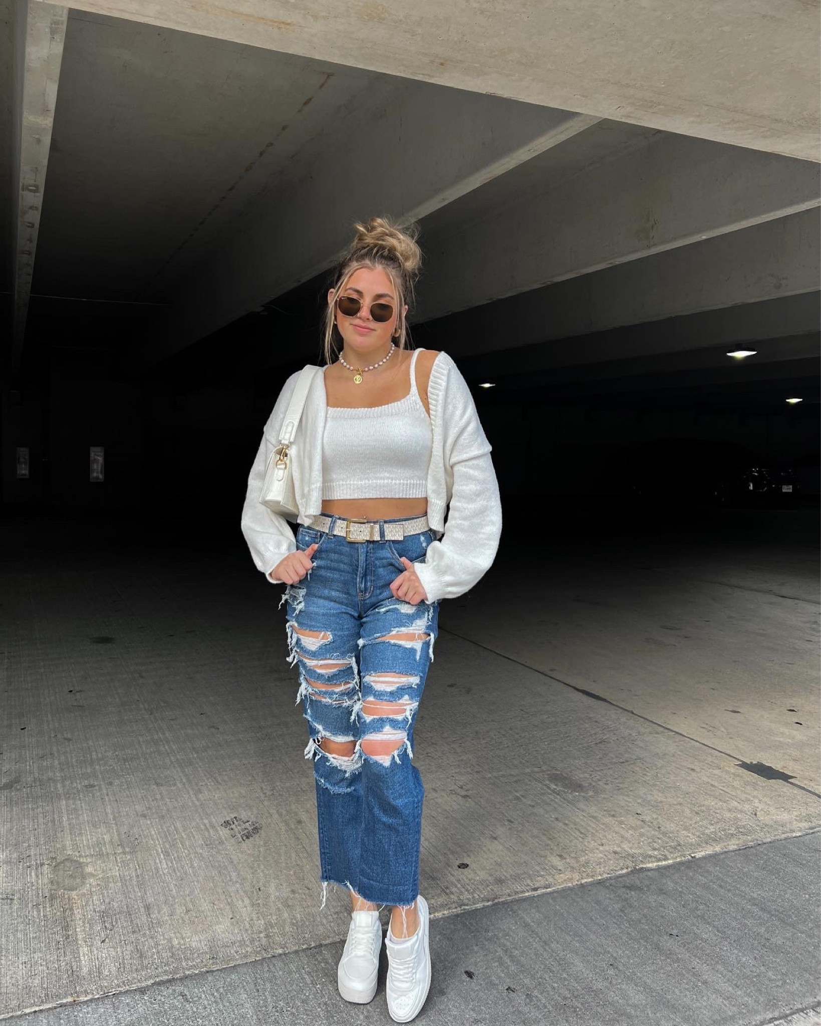 The distressed jeans add an edgy, contemporary vibe while the neutral tones of the top and sneakers create a balanced, chic look. The addition of the small shoulder bag and light outerwear piece offers both functionality and a layered texture that enhances the overall style.