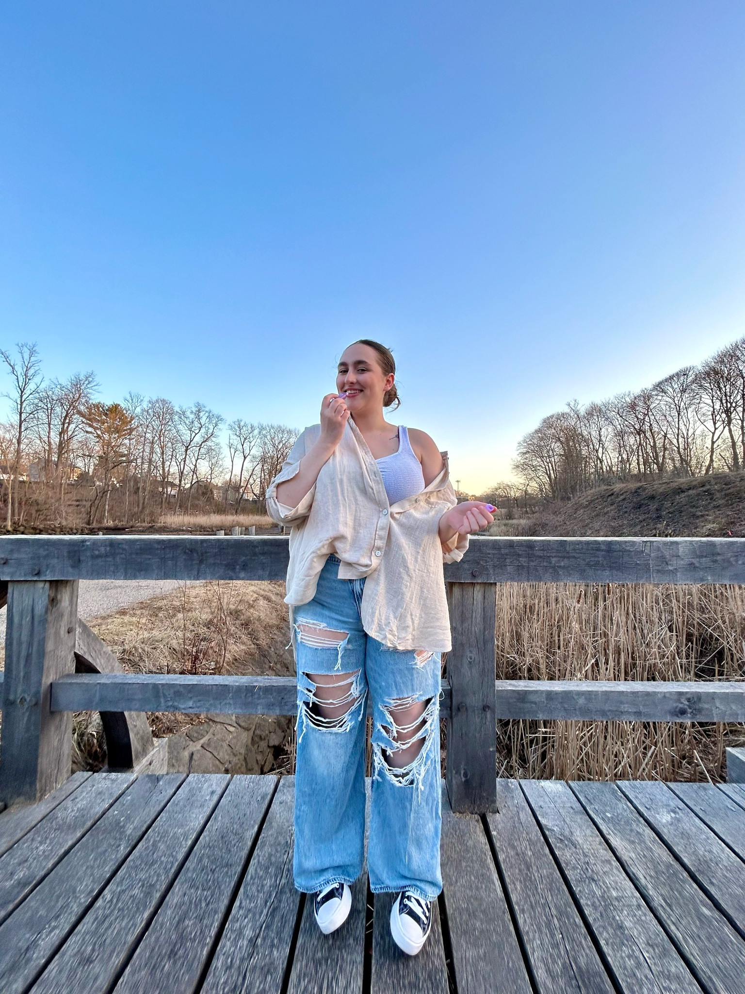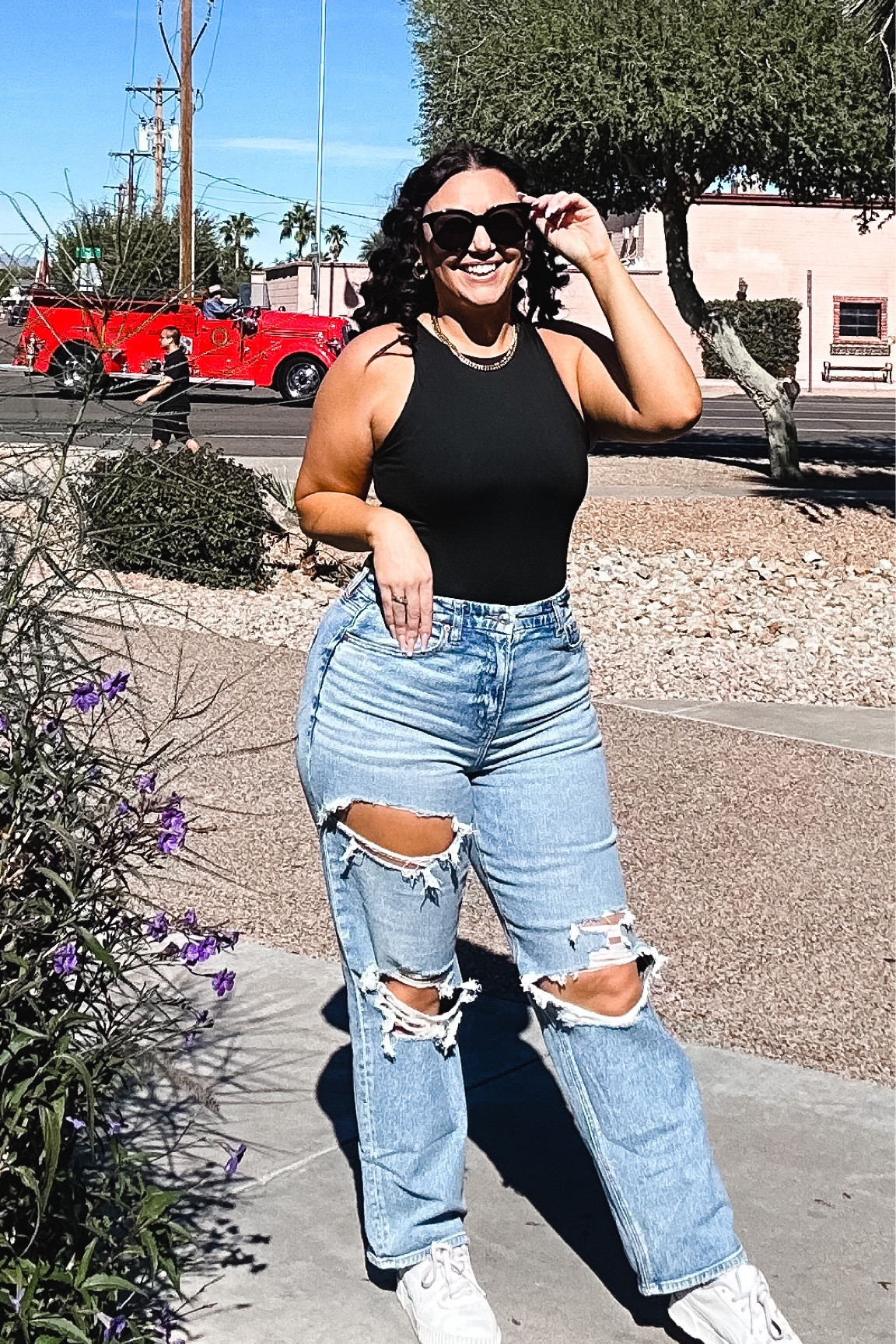 The outfit exudes a casual yet chic vibe with its balance of ripped jeans and a simple, elegant tank top. The white sneakers add a fresh, effortless touch, perfect for a day out.