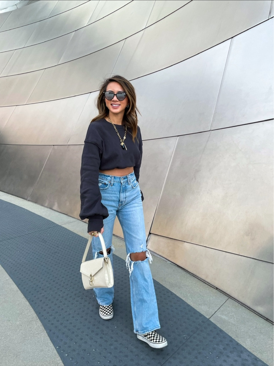 The cropped sweatshirt pairs perfectly with high-waisted jeans, accentuating the waistline and balancing the relaxed fit of the bottoms. The checkered Vans add a playful yet classic touch to the entire ensemble, which is both comfortable and stylish.