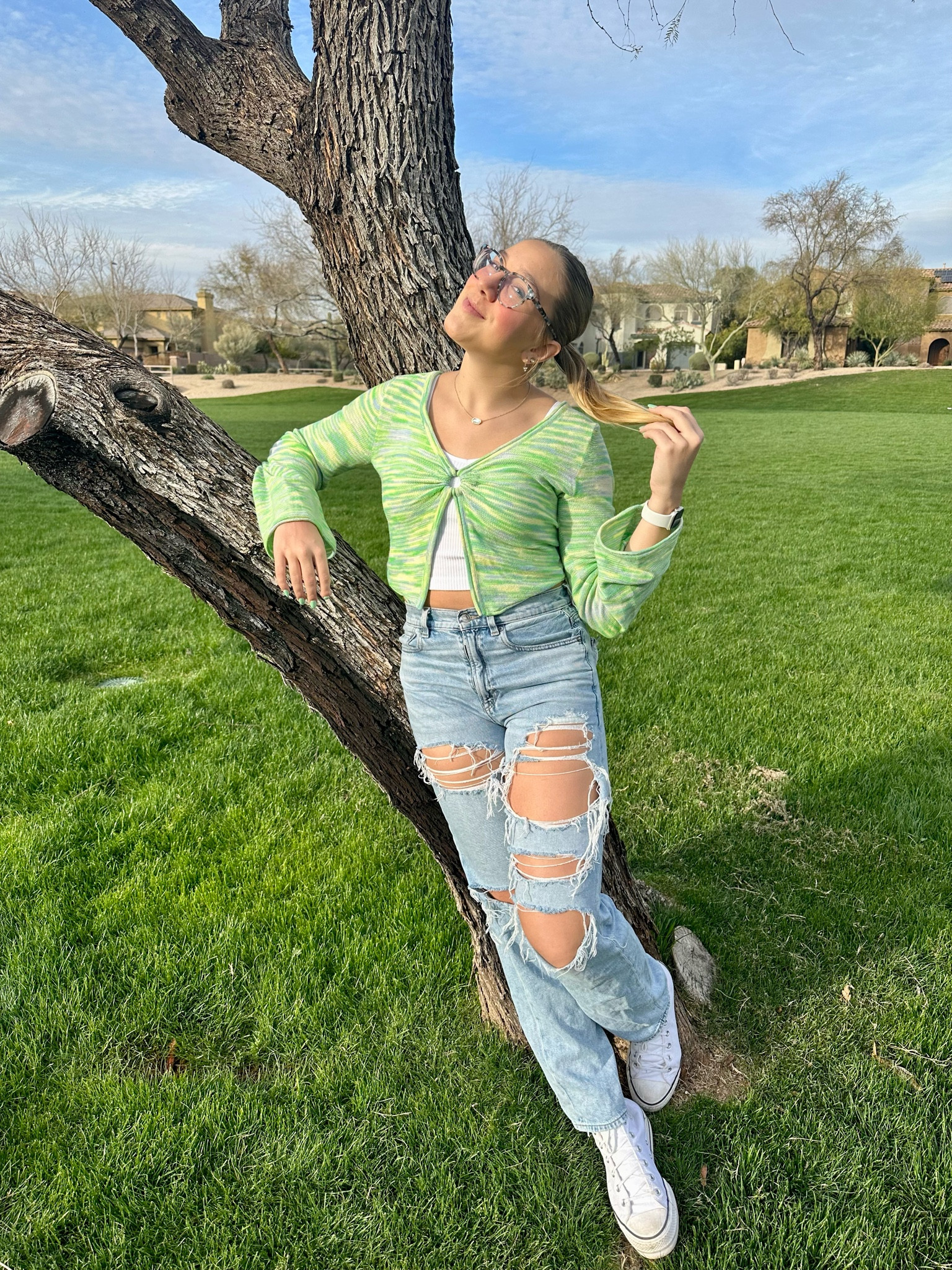 The playful juxtaposition of distressed denim with a fresh, zesty striped top creates a balanced ensemble that’s both edgy and vibrant. Accessories like round sunglasses add a touch of retro charm, enhancing the overall casual chic vibe.