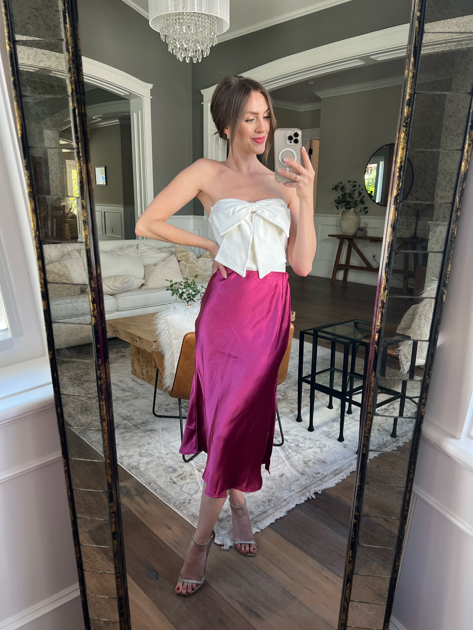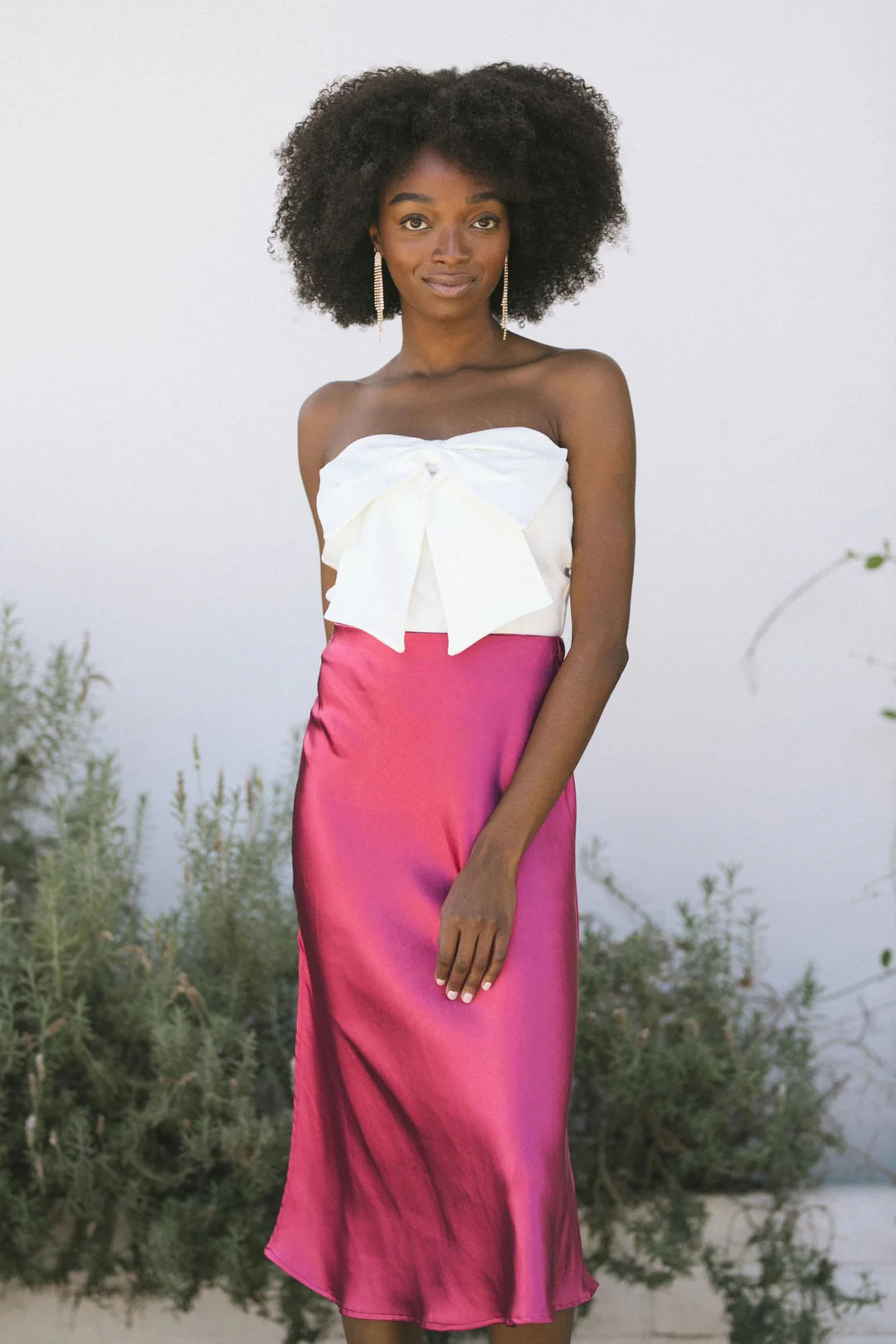 I love how the white bow top creates a chic and elegant contrast with the bold, vibrant pink skirt. The satin sheen and the flattering midi length add a touch of sophistication, perfect for both day and night events.