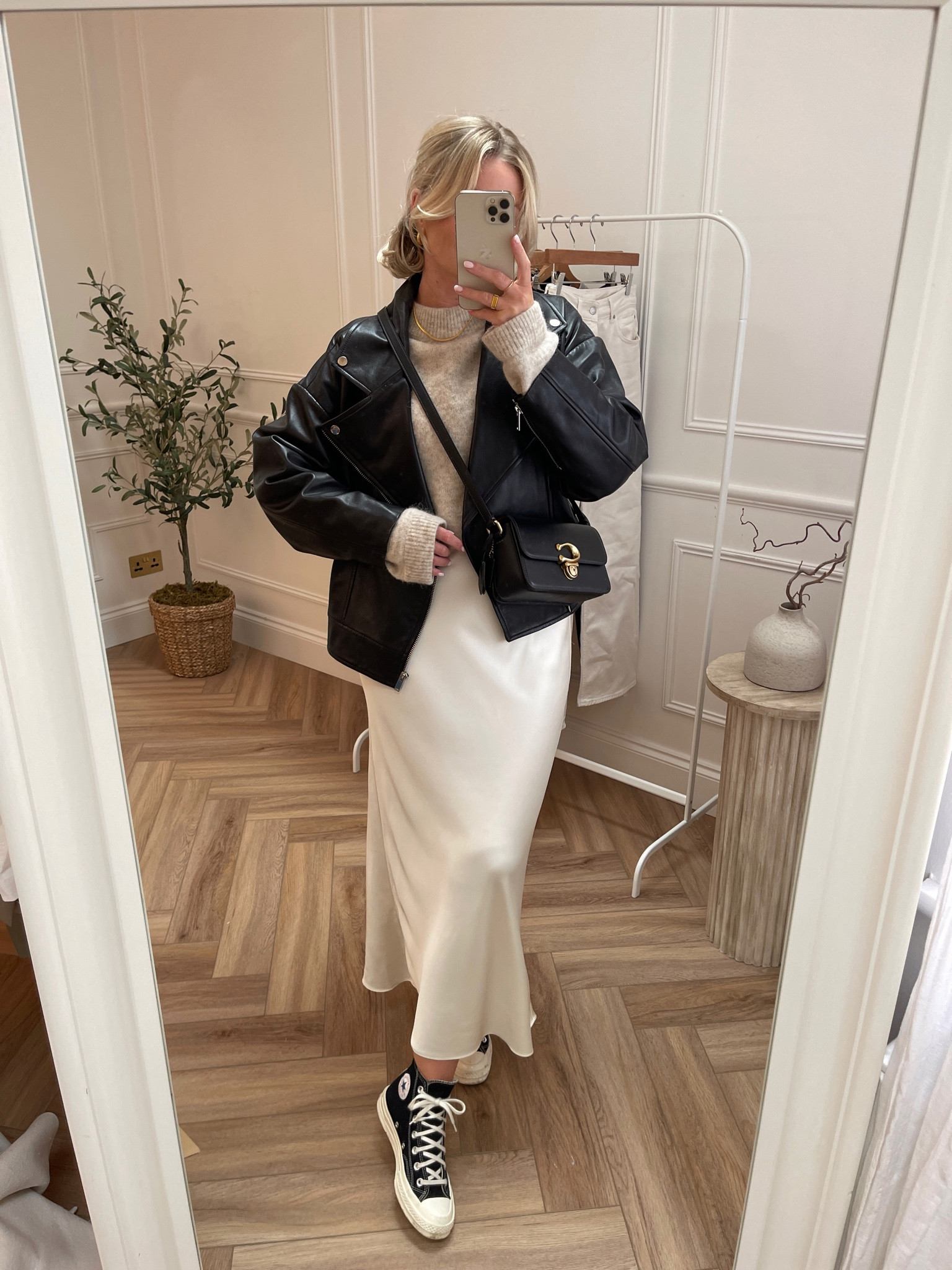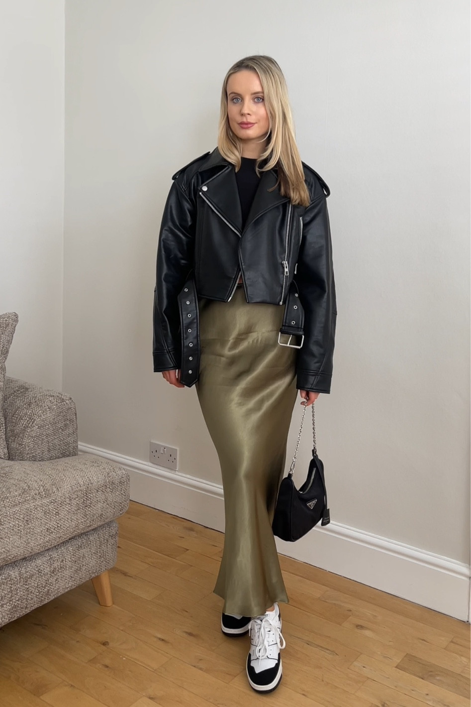 I love this outfit because it effortlessly combines edgy and chic with the leather jacket and silky skirt, creating a balanced, stylish look. The sneakers add a comfortable, modern twist that keeps the ensemble fresh and approachable.
