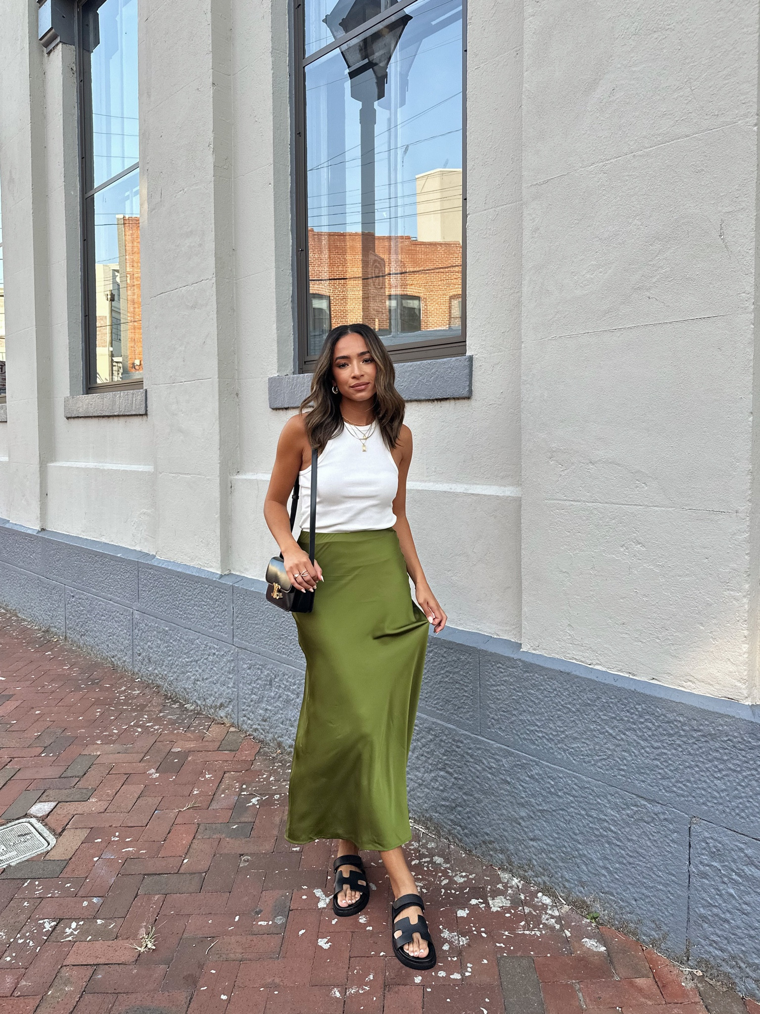 I love how the simple white top and elegant green skirt create a clean, fresh look that’s perfect for any casual outing. The black sandals and small crossbody bag add just the right touch of effortless style and functionality.