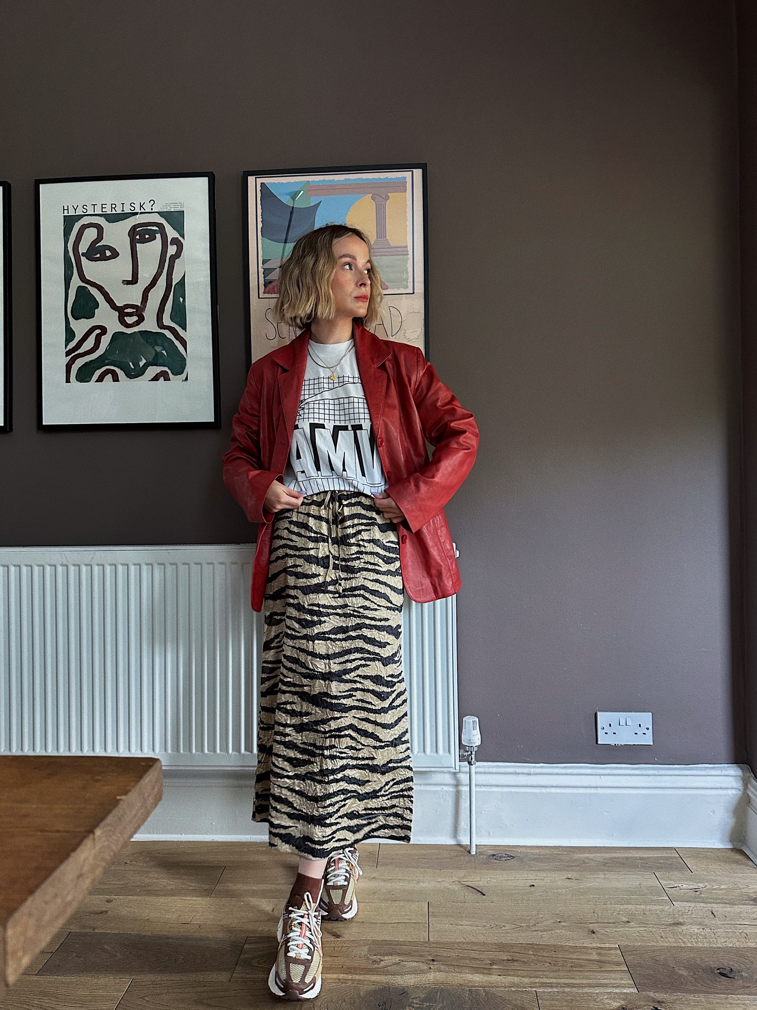 I love how the bold red jacket adds a pop of color and sophistication while perfectly balancing the wild zebra print skirt for an eye-catching look. The graphic tee and casual sneakers bring a laid-back vibe, making the outfit effortlessly chic and modern.
