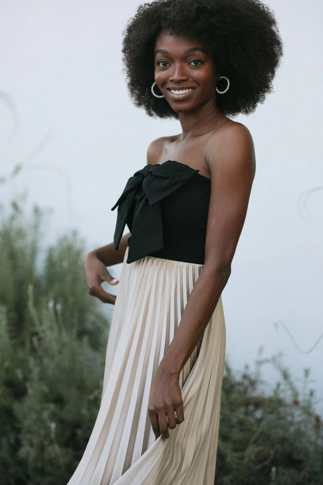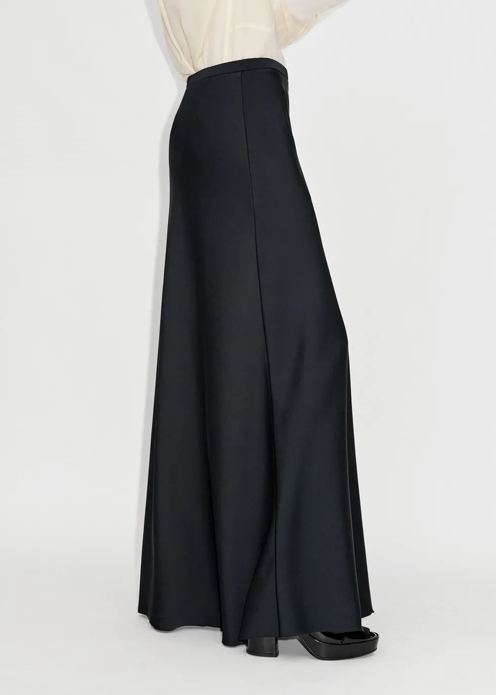 I love this outfit because the sleek black top paired with the flowing, elegant skirt creates a perfect balance of sophistication and minimalism. The neutral handbag and classic heels add just the right touch of polish and practicality.