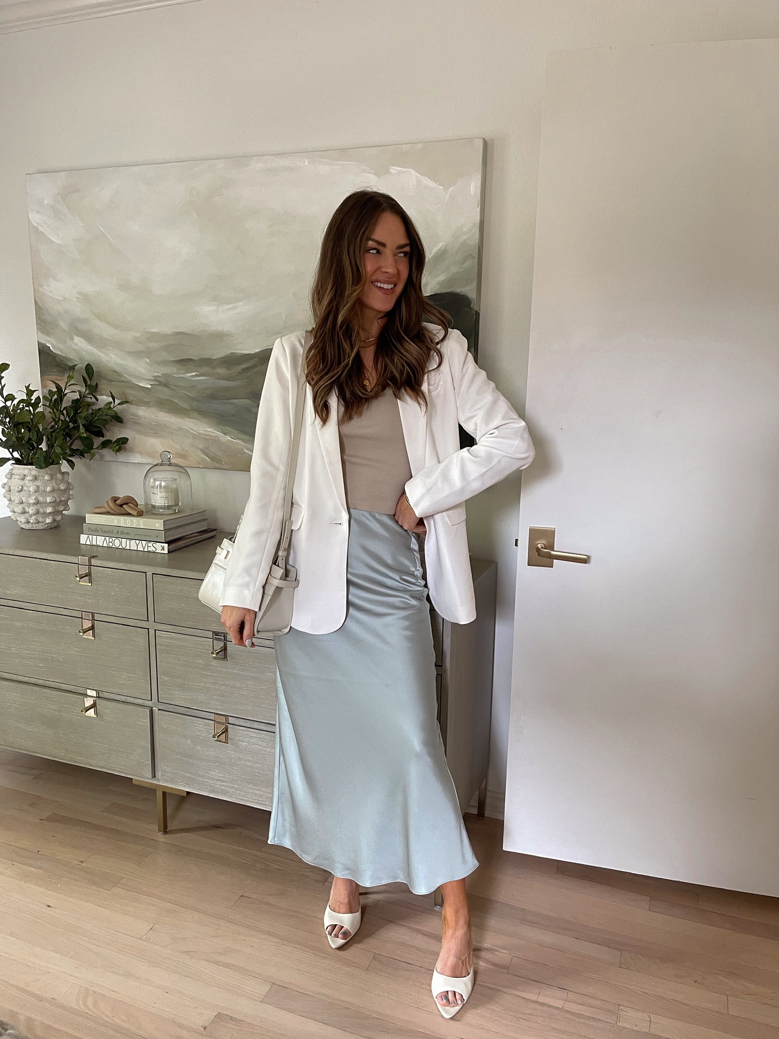 I love how the white blazer complements the soft pastel skirt, creating a clean and sophisticated look. The neutral top and stylish heels tie the outfit together perfectly, making it effortlessly chic and modern.