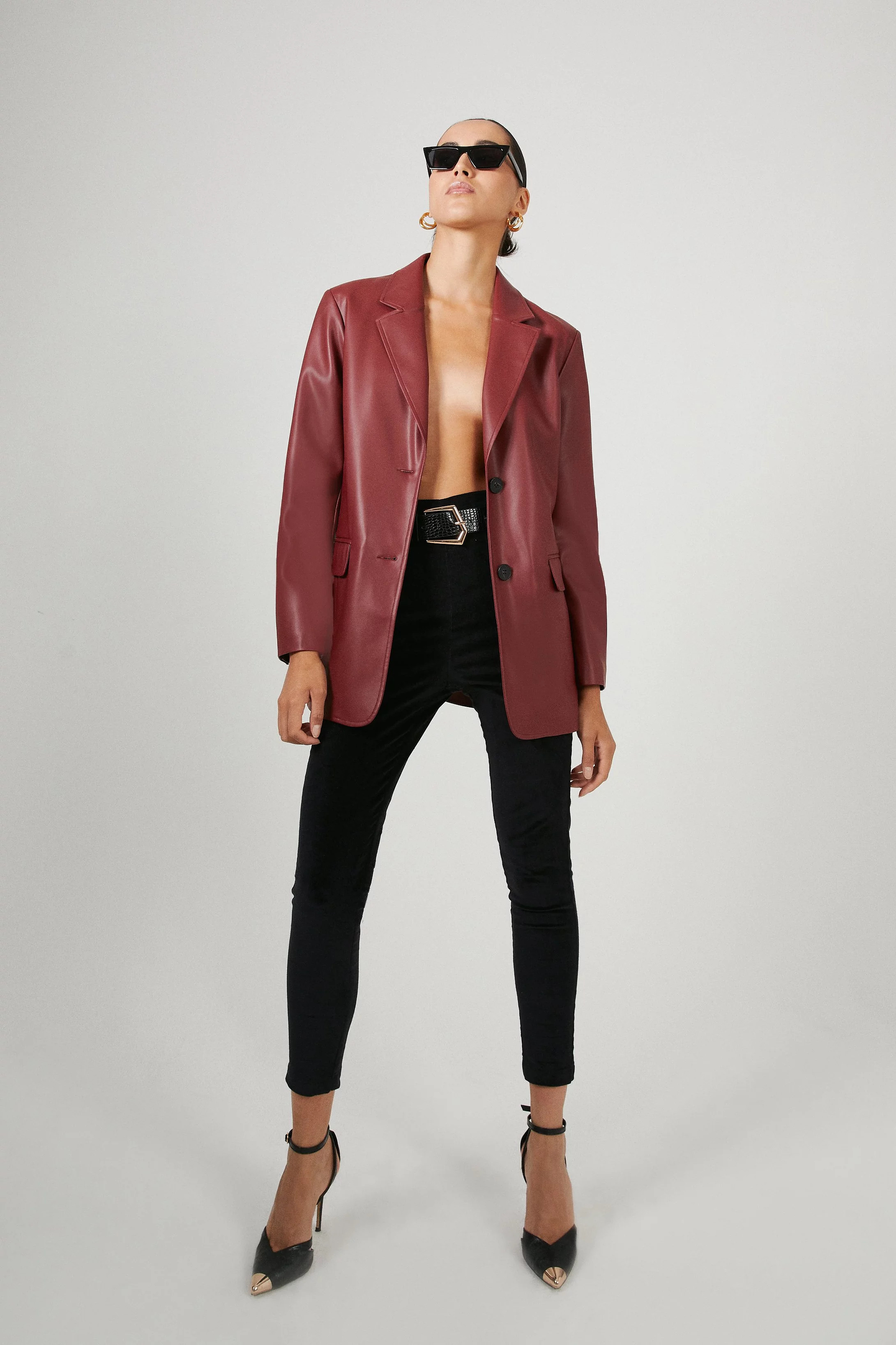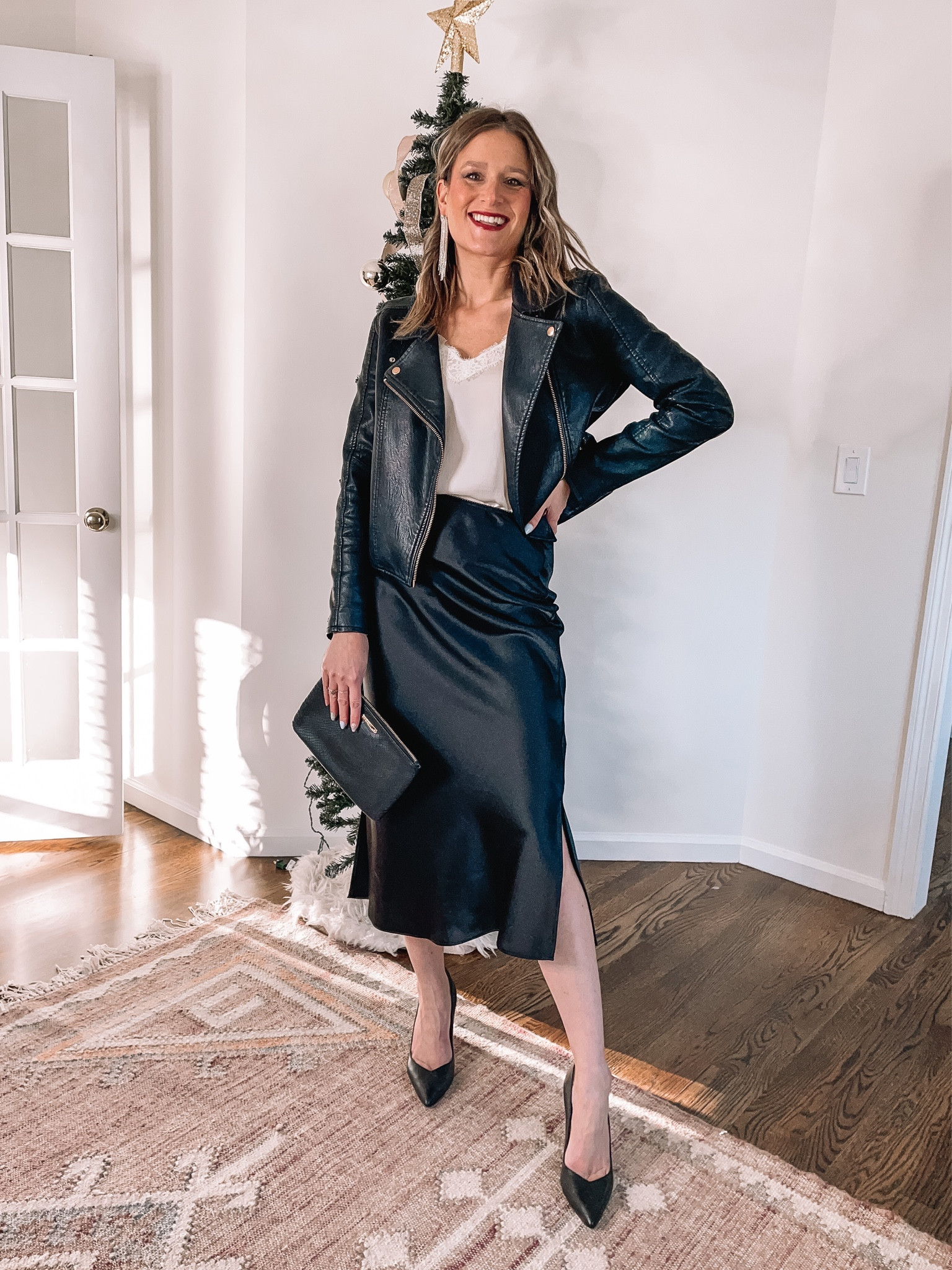 I love the elegant contrast between the silky slip dress and the edgy leather jacket, which creates a chic and balanced look. The pointed heels and sleek clutch add a touch of sophistication, perfect for a stylish night out.