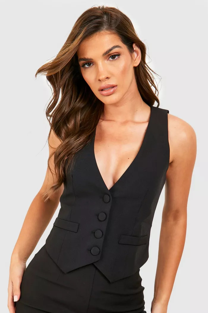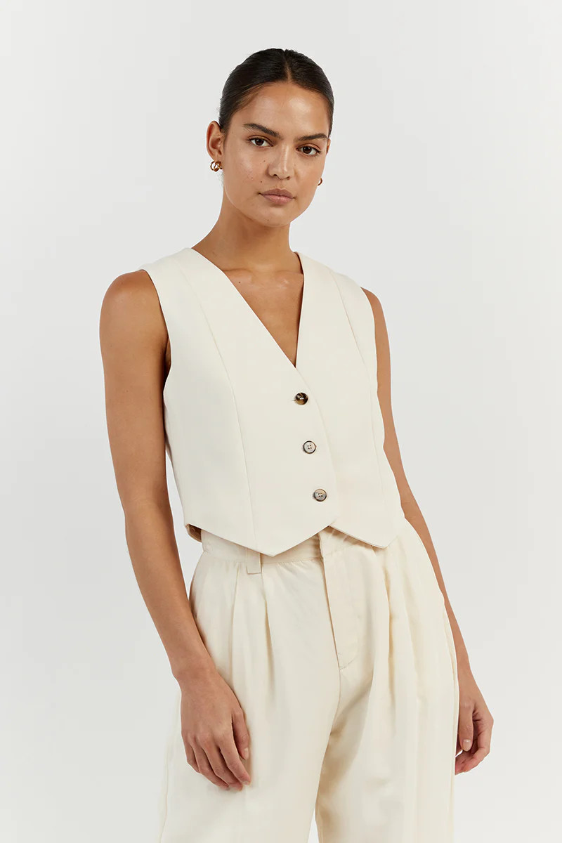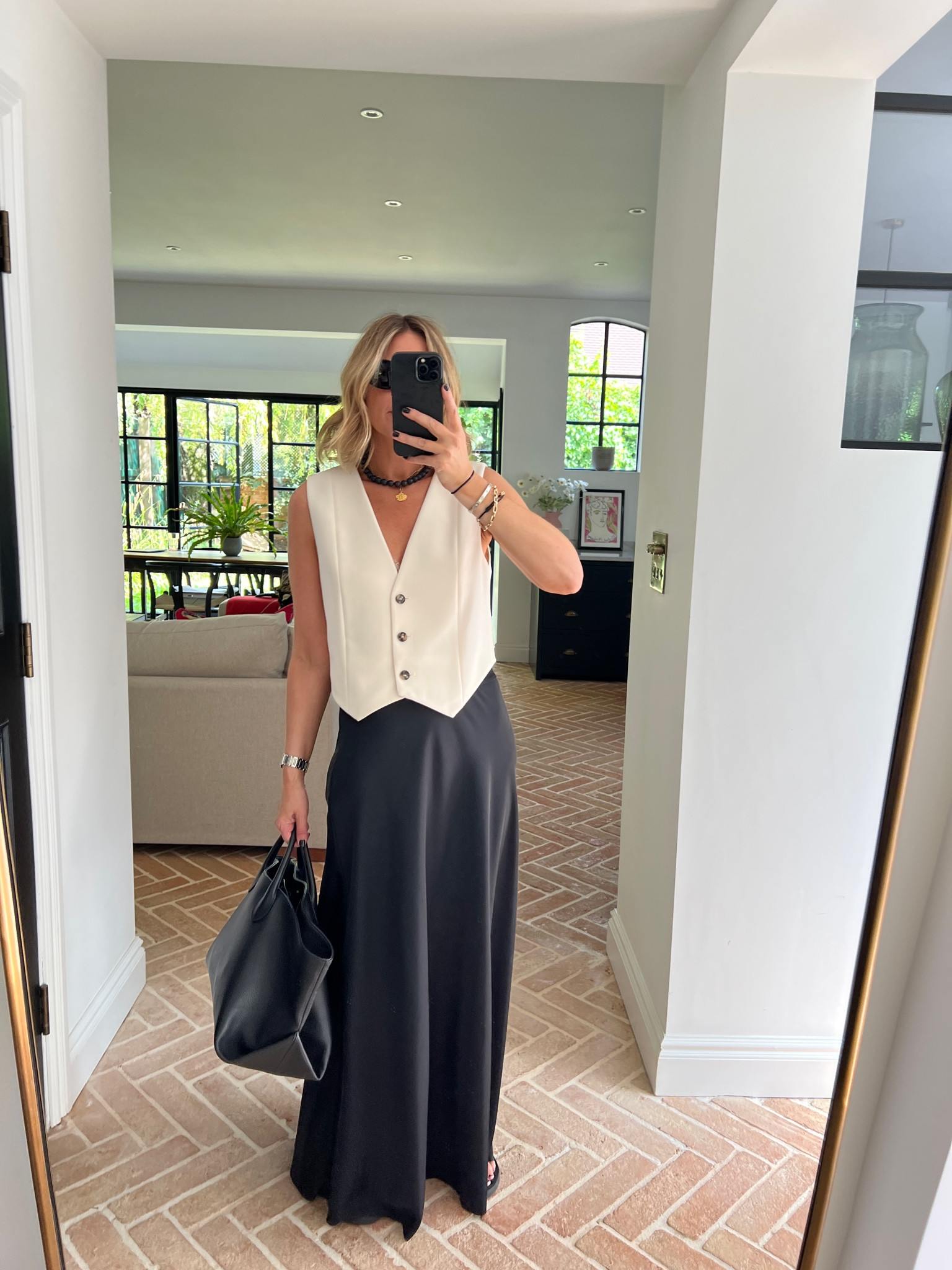 I love how the minimalist white and black ensemble exudes effortless sophistication, with the tailored vest adding structure and the long skirt offering elegant flow. The accessories and black handbag perfectly complement the look, making it polished yet understated.