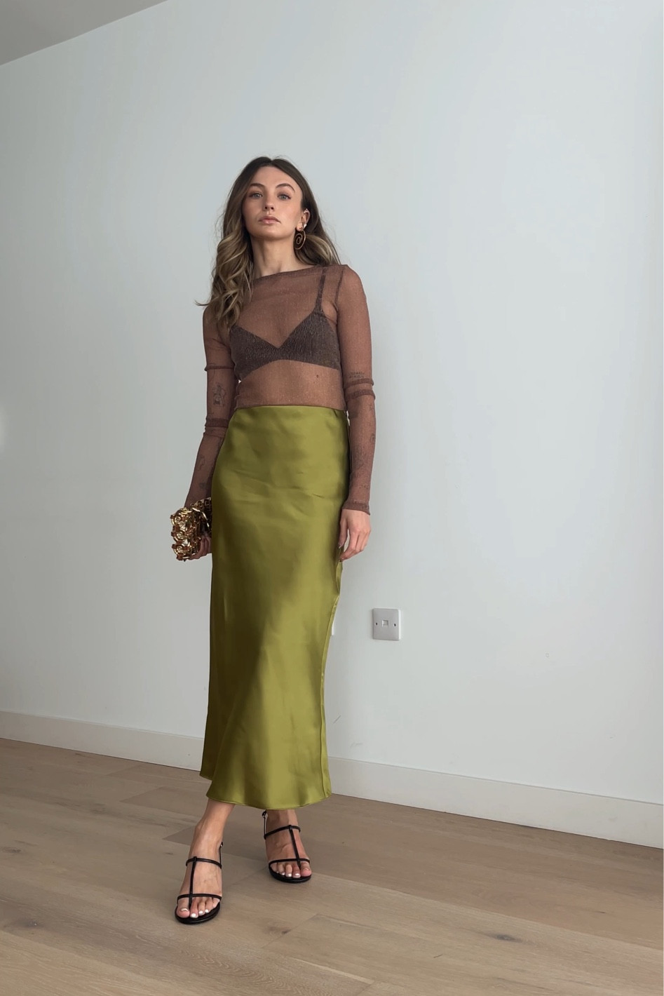 I love this outfit because the delicate sheer top perfectly contrasts with the luxurious texture of the satin skirt, creating a sophisticated yet edgy look. The choice of accessories and strappy sandals elegantly pulls the entire ensemble together.
