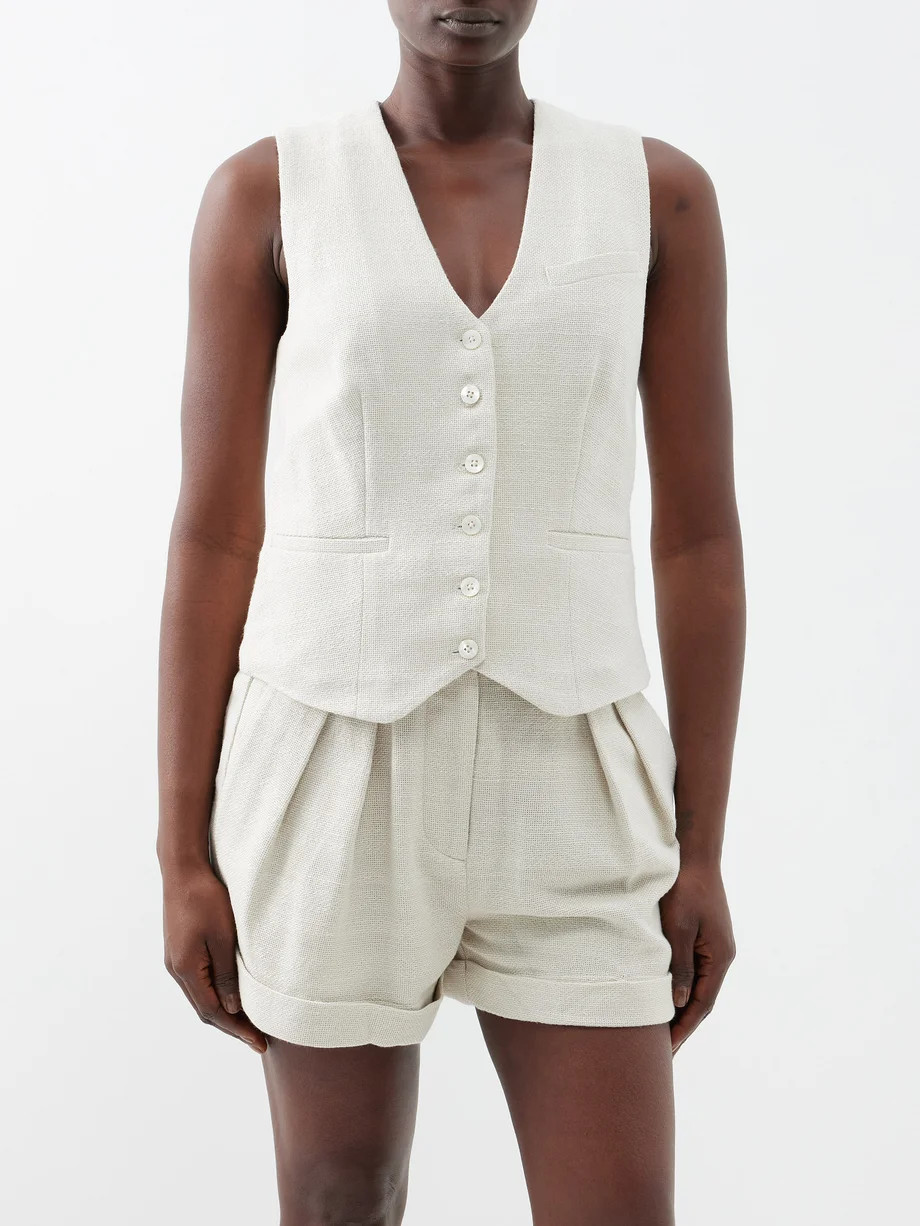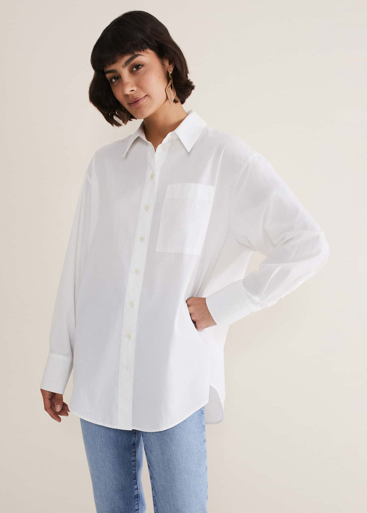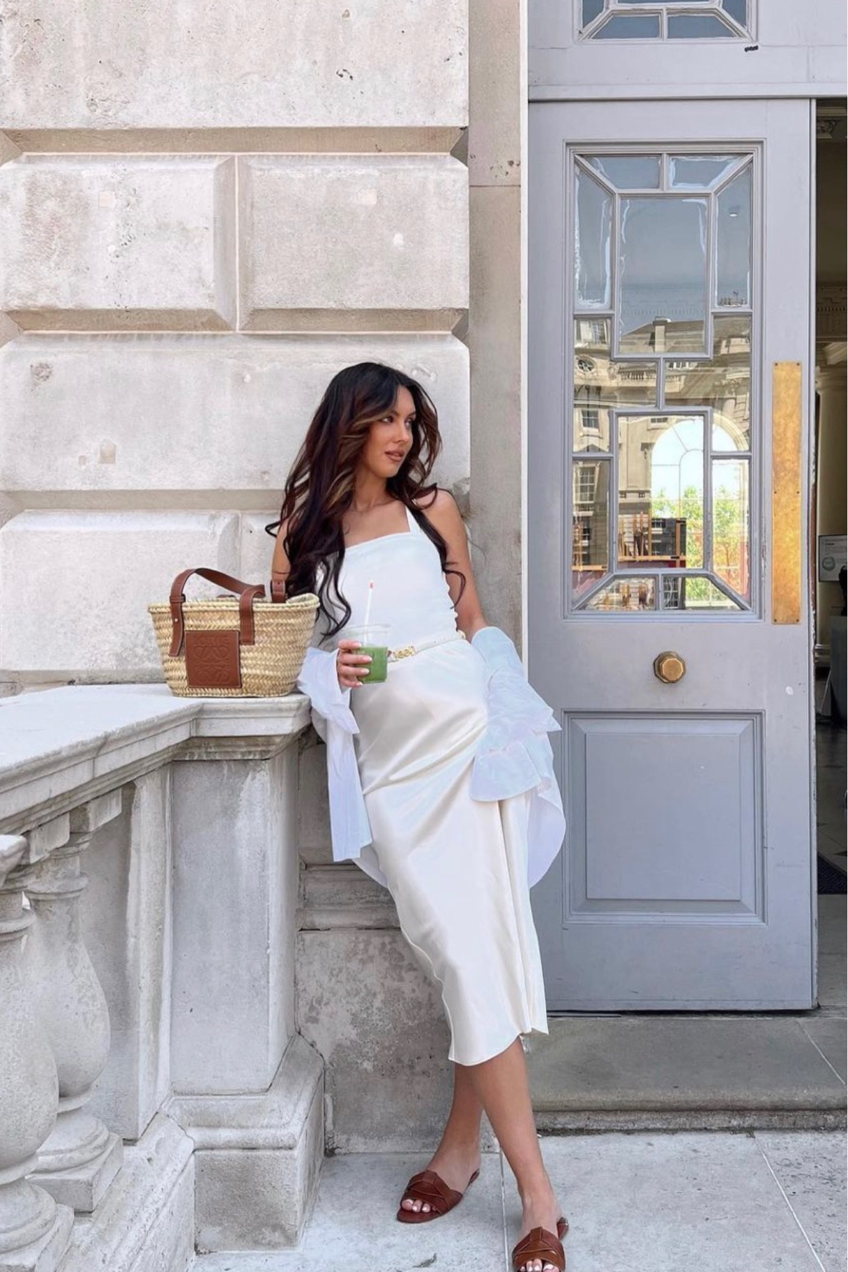 The combination of the crisp white dress with the chic basket bag and casual slides creates a perfect blend of elegance and laid-back summer style. I love how the airy fabric and sophisticated layering accentuate a relaxed yet polished look.