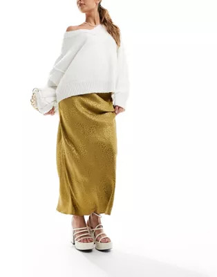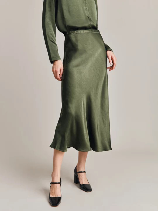 I love the combination of the elegant dark green sweater with the sleek black satin skirt; it’s both festive and sophisticated. The black heels tie the entire outfit together, making it perfect for a holiday party.