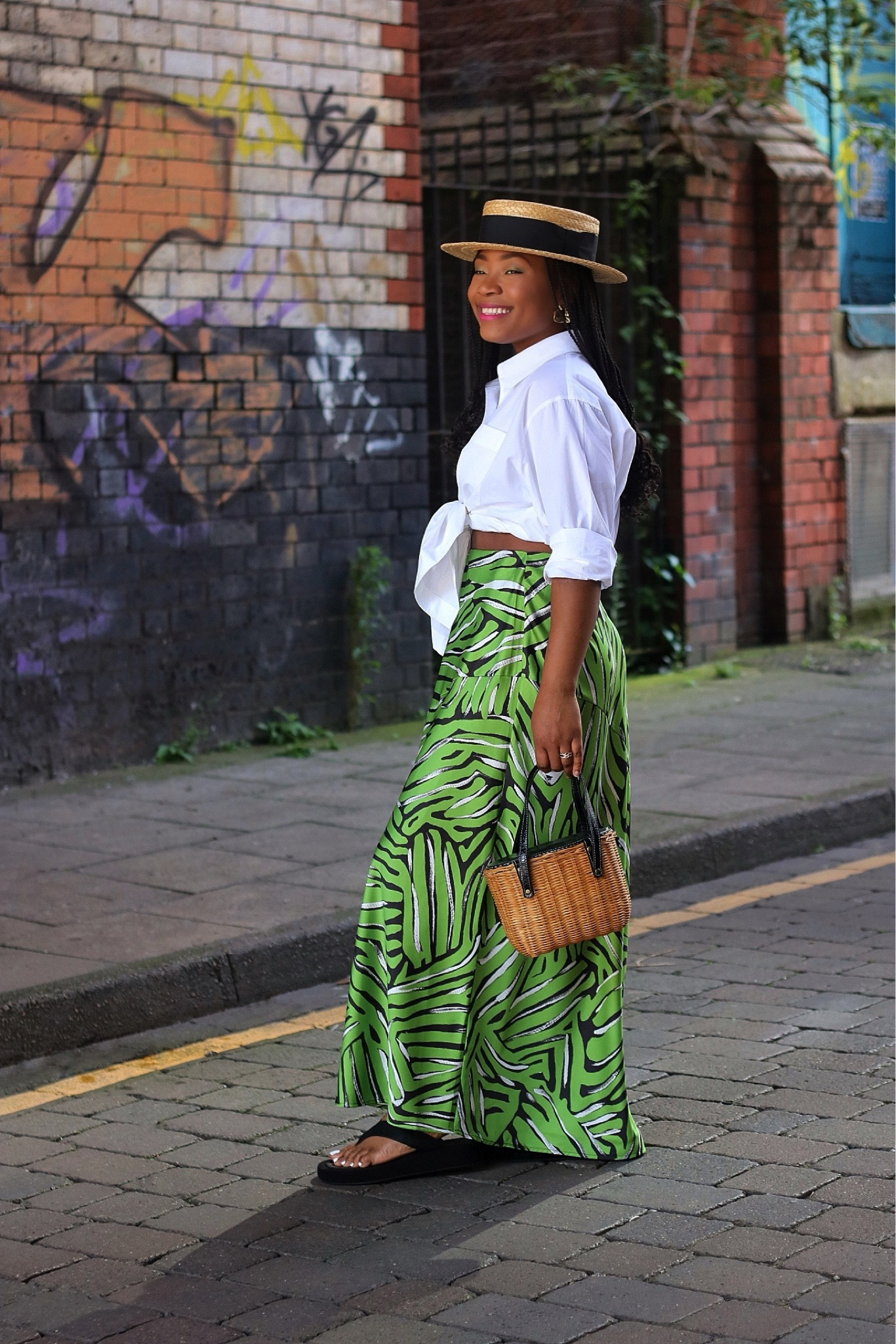 I love how the crisp white shirt and wide-brim hat create a chic, timeless look, perfectly balanced by the vibrant, tropical print of the skirt for a fresh, modern twist. The small wicker bag and simple sandals add a touch of effortless elegance, making it a perfect summer outfit.