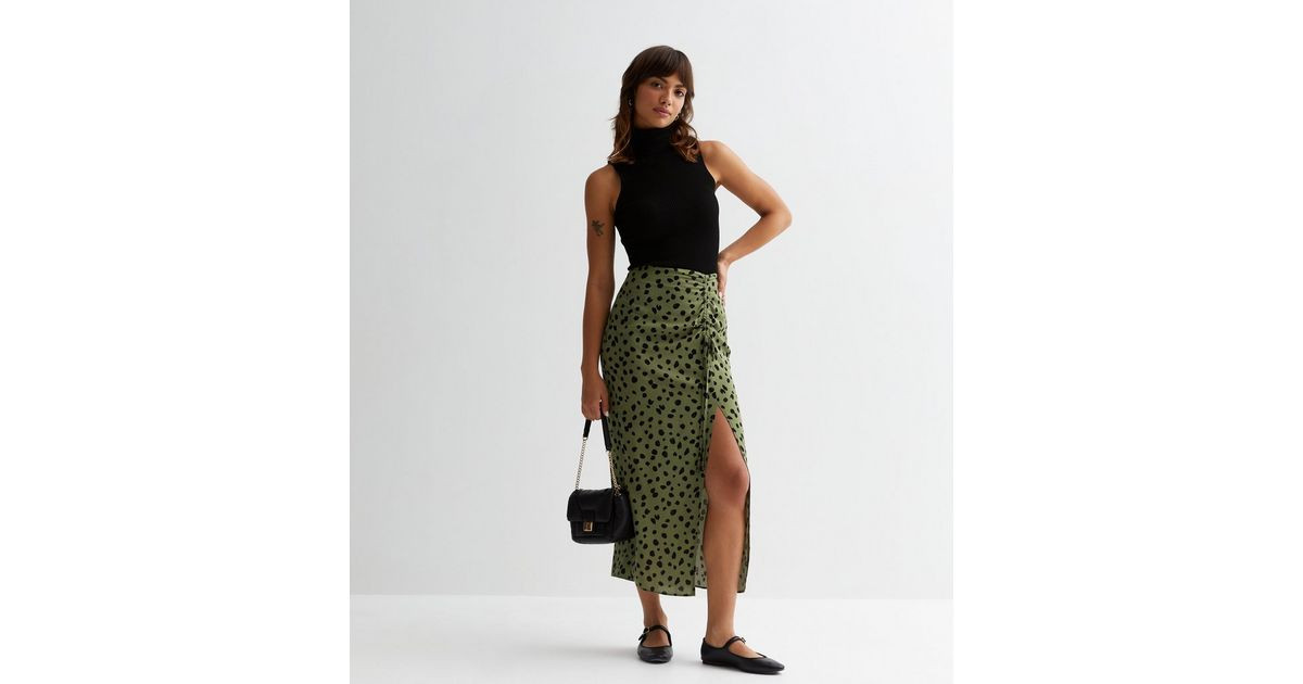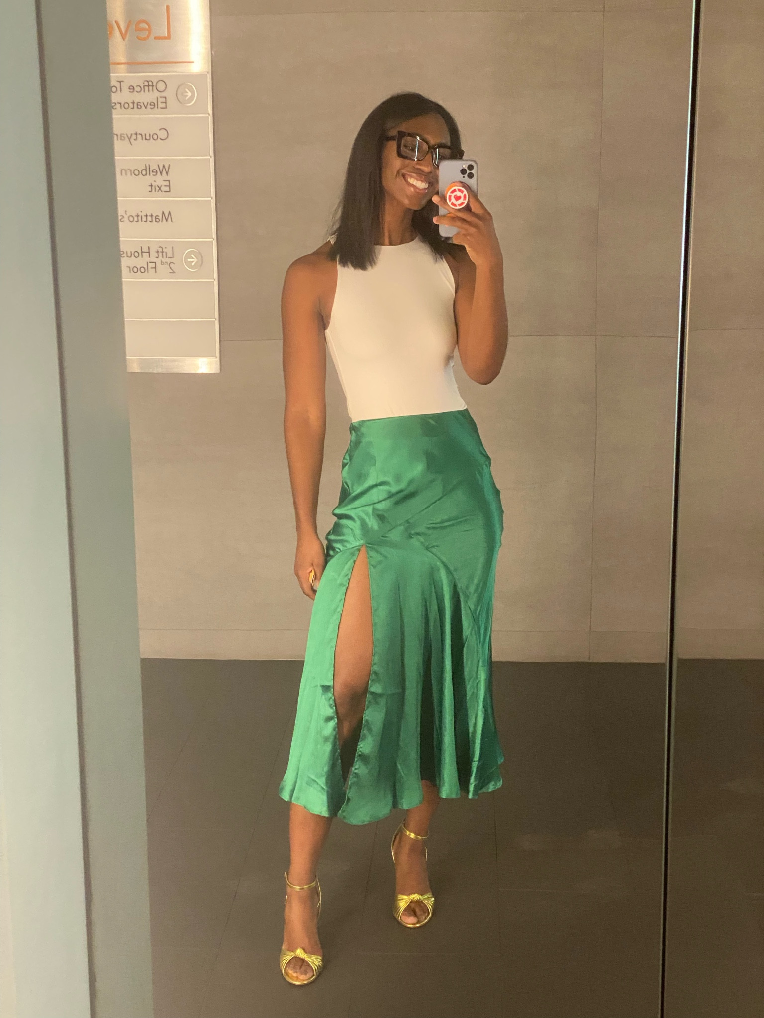 I love how the sleek white top perfectly balances the vibrant green skirt, creating a fresh and modern look. The high slit adds just the right touch of elegance and playfulness to the outfit.