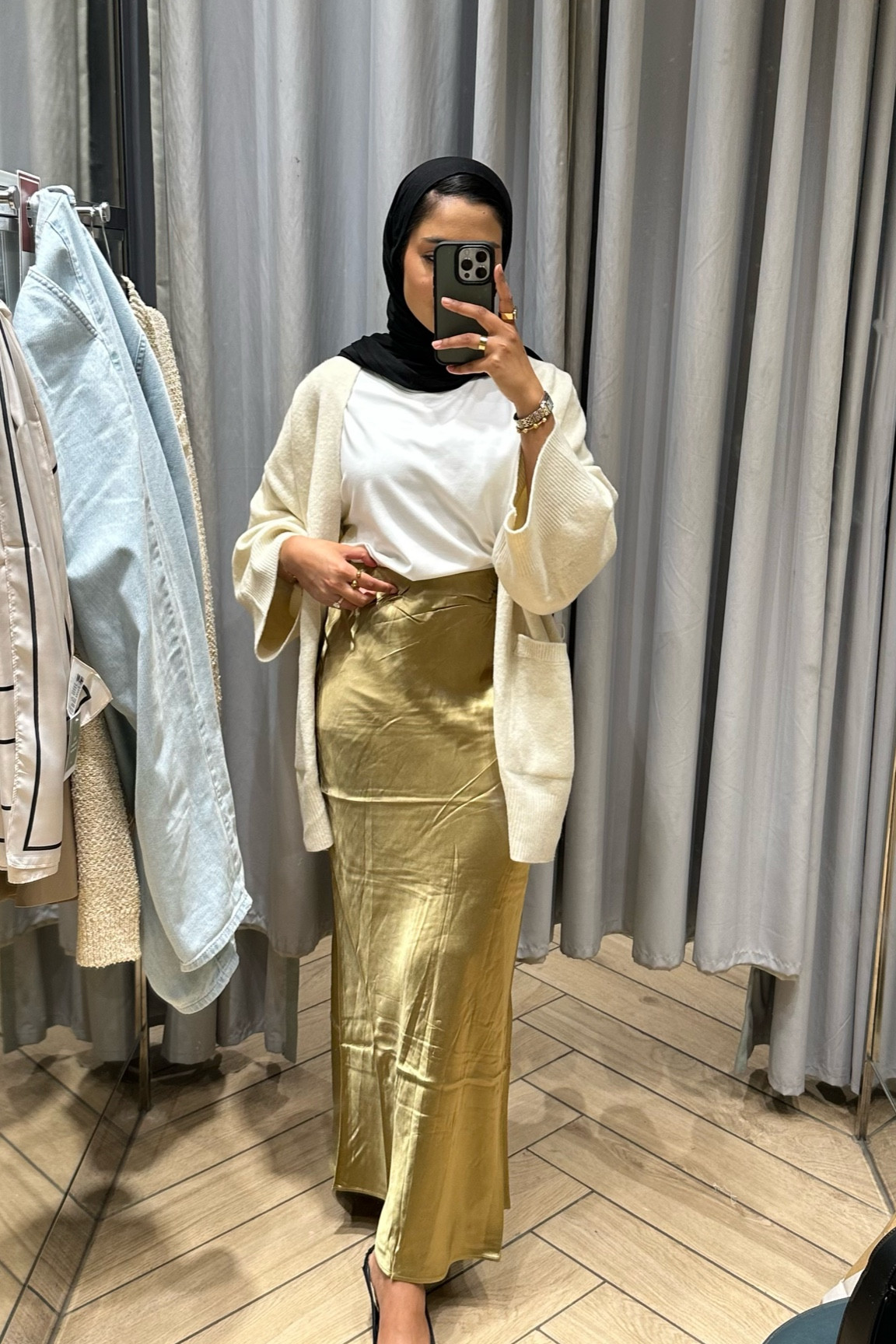 I love how the neutral tones of the white top and cream cardigan create a classic, elegant look, while the gold satin skirt adds a touch of luxury and sophistication. The hijab seamlessly complements the outfit, and the overall ensemble strikes a perfect balance between modesty and chic style.