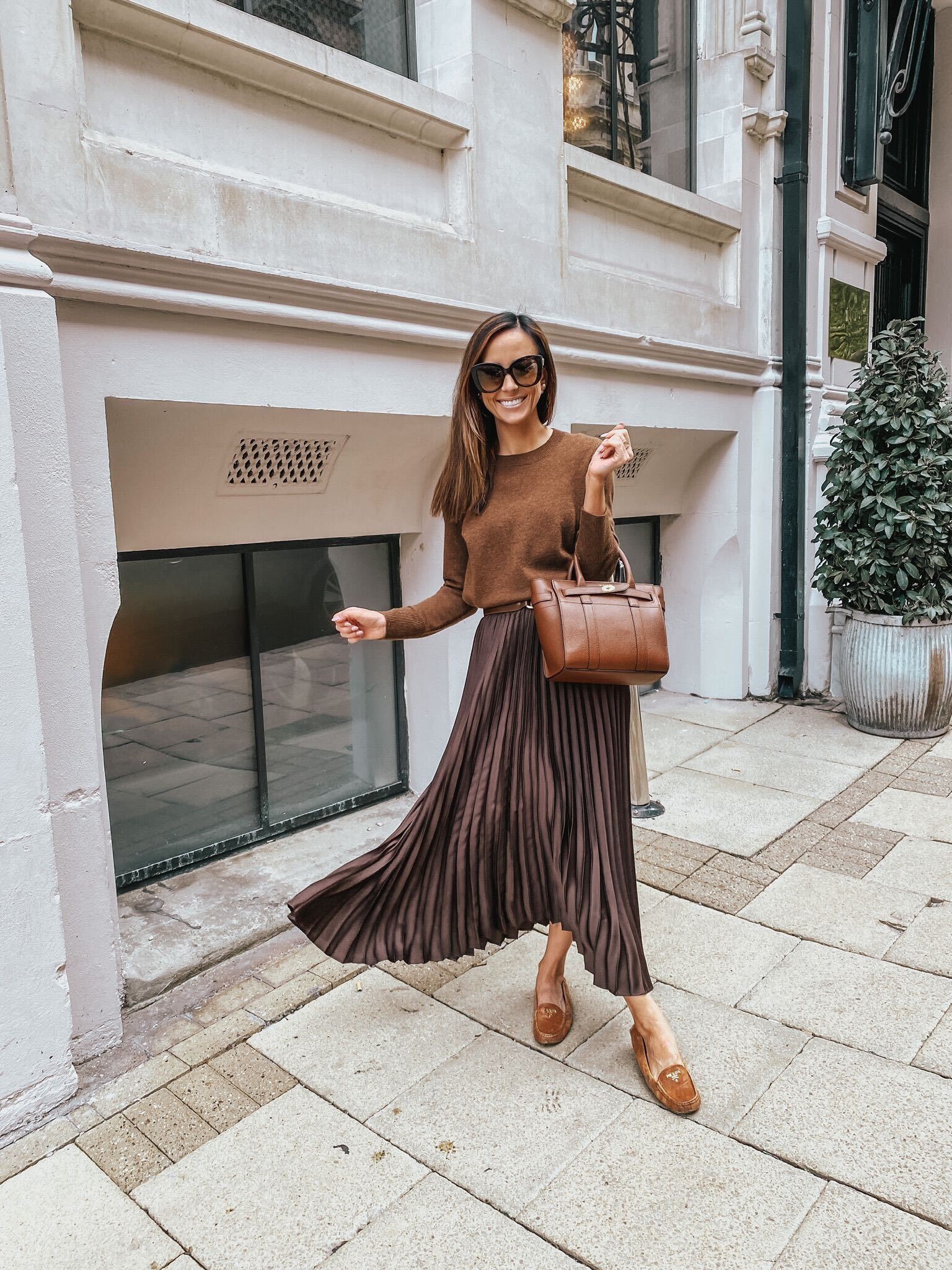 I love how the rich brown tones of the sweater and pleated skirt create a cohesive, warm look that’s perfect for fall. The outfit is effortlessly stylish, and the accessories add a touch of sophistication.