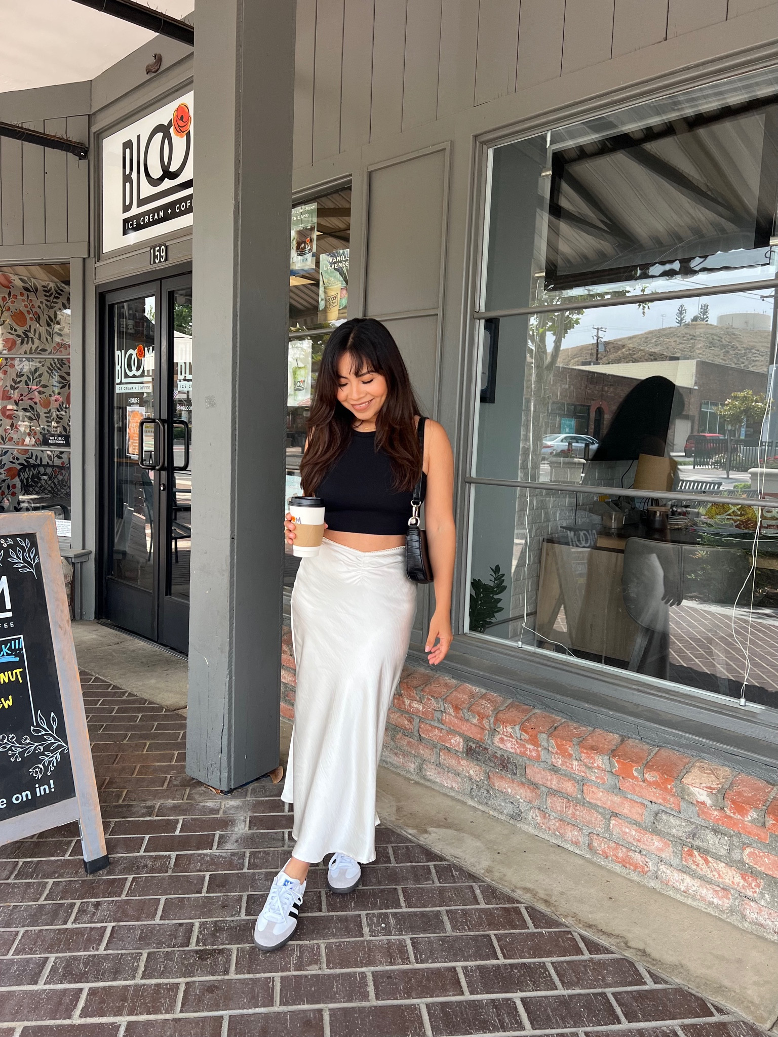 I love this outfit because the black crop top paired with the chic white satin skirt creates a stylish contrast, and the sneakers add a comfortable, casual touch that’s perfect for everyday wear. The look is effortlessly put together yet trendy, making it versatile for various occasions.