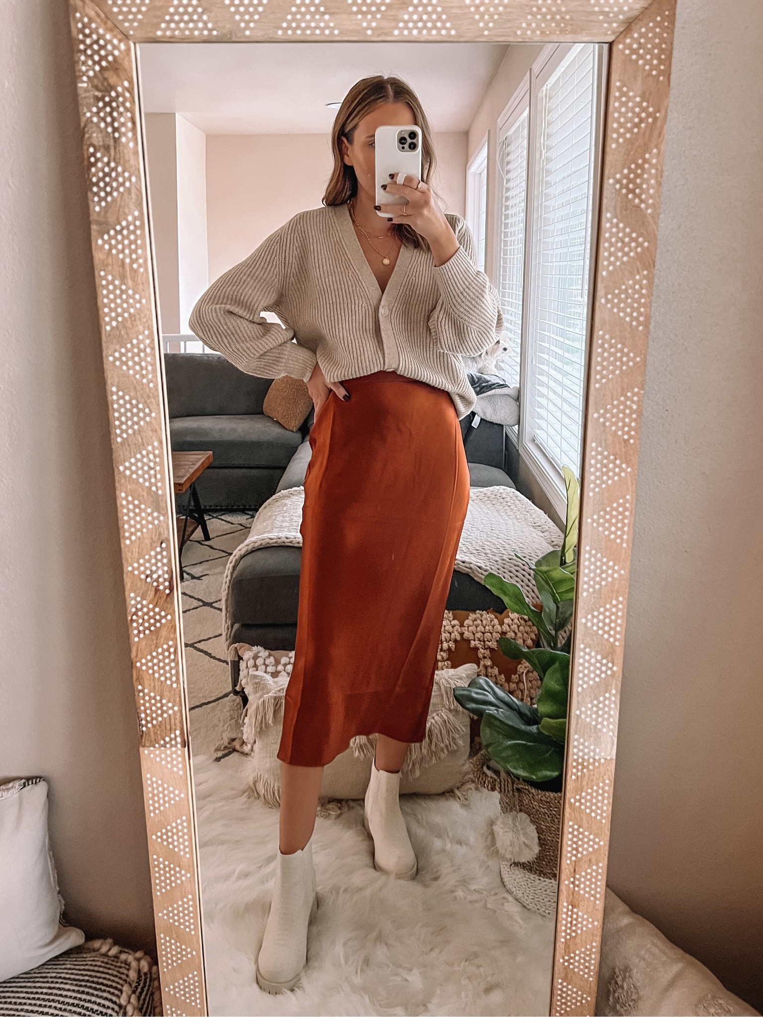 I love how the chunky knit sweater pairs effortlessly with the sleek, rust-colored midi skirt, creating a perfect balance of textures. The white ankle boots add a modern, chic touch that ties the entire look together beautifully.