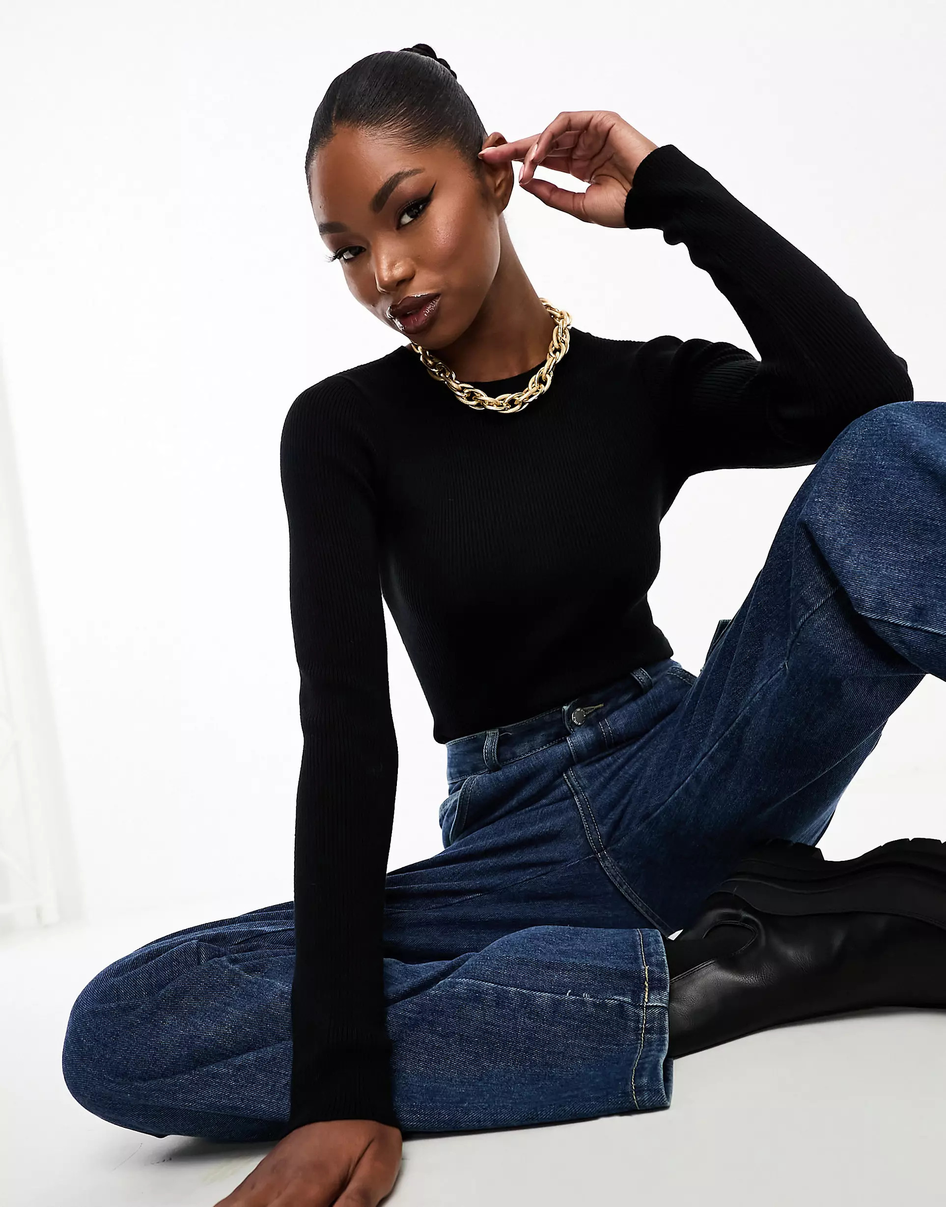 I love how the sleek black top pairs perfectly with the elegant chocolate-brown skirt, creating a sophisticated yet stylish look. The high-waisted silhouette and boots elongate the frame, giving a chic and polished finish.