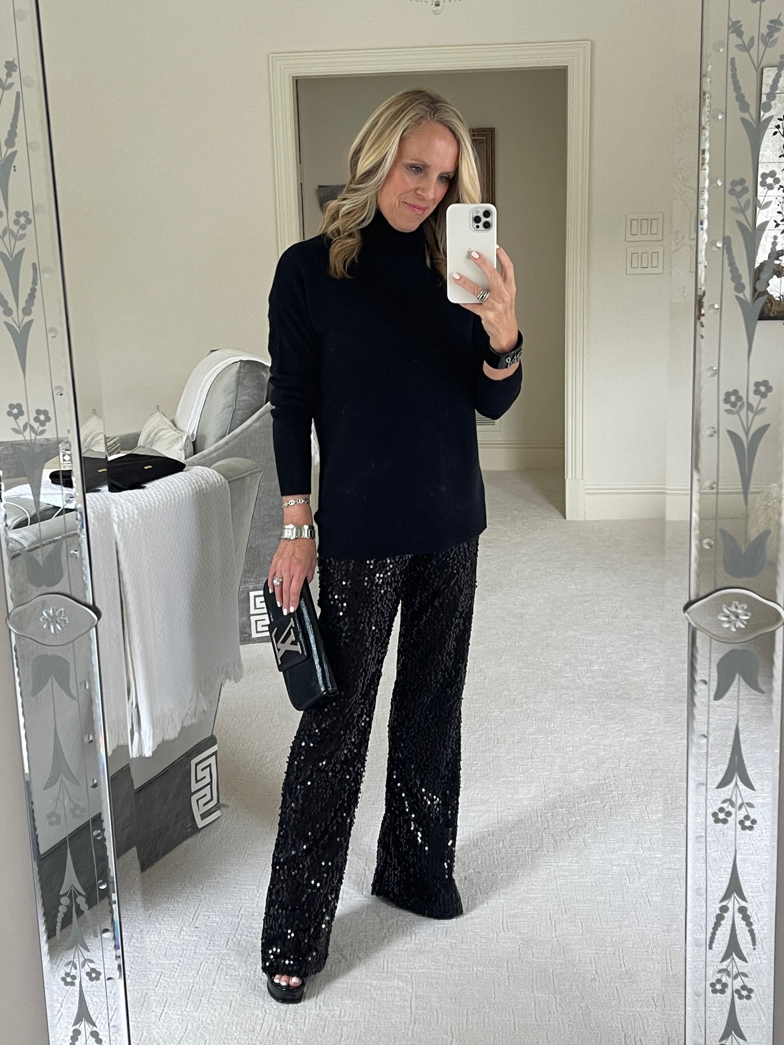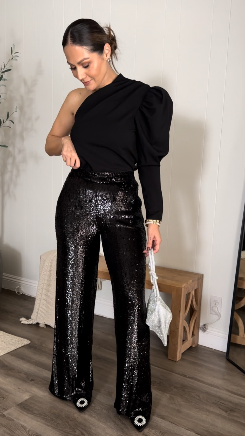 The blend of the classic black sweater with dazzling sequined trousers creates a harmonious balance between understated elegance and glamorous flair. Additionally, the chic pointed-toe heels and the textured clutch add a sophisticated touch, perfect for an evening event.