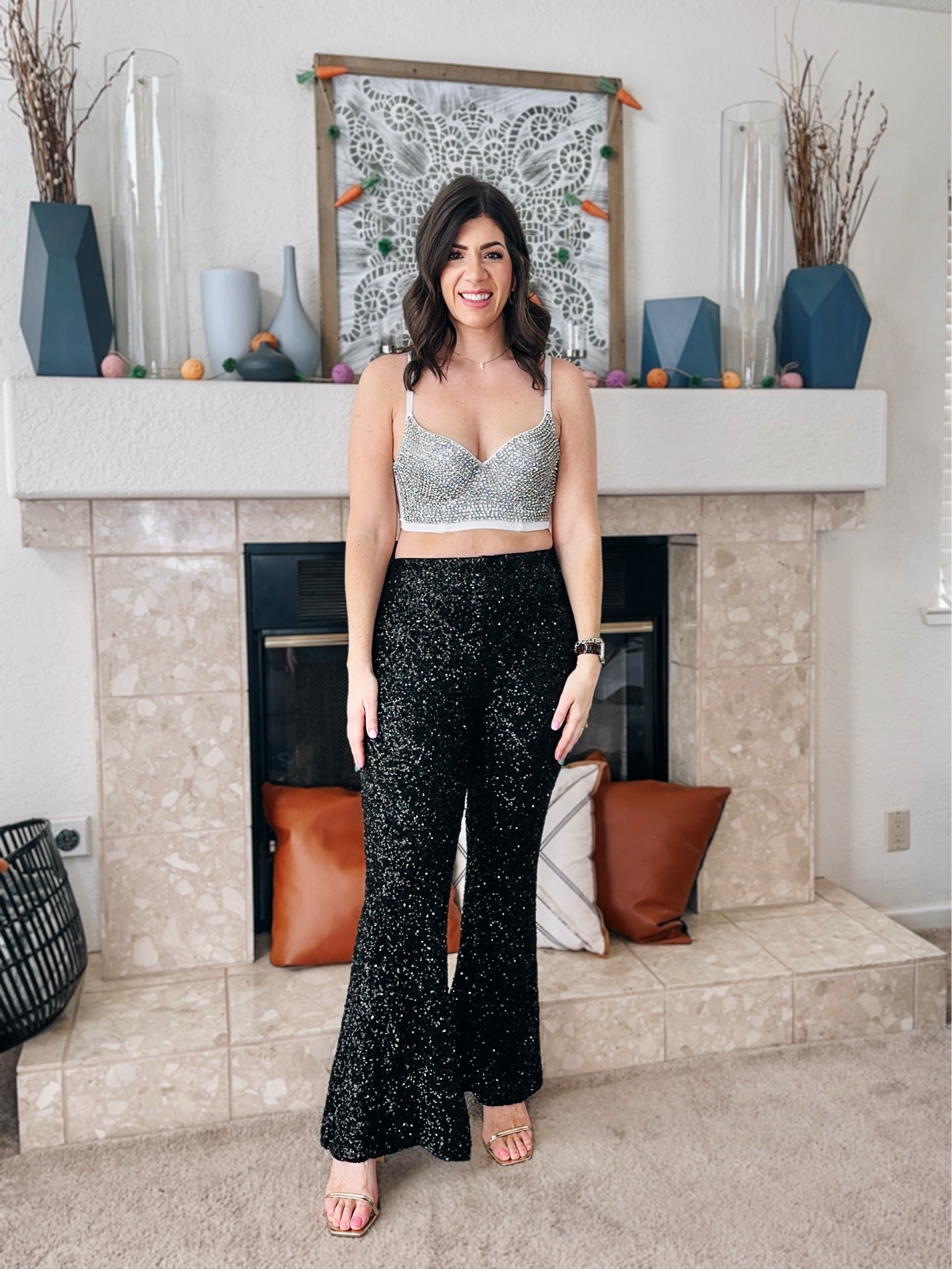 The high-waisted sequined trousers make a bold statement, adding a touch of glamour and elongating the silhouette, while the black top keeps the ensemble balanced and chic, allowing the pants to shine as the focal point.